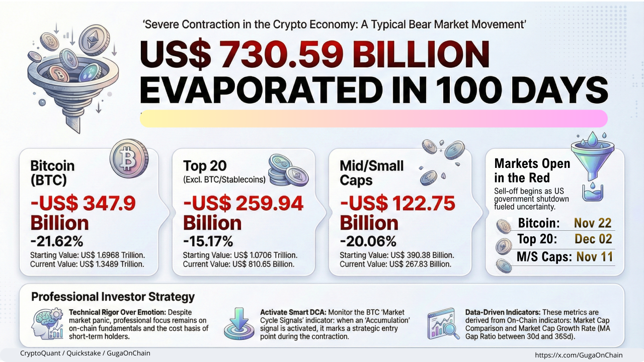 Secara keseluruhan, total dana yang keluar dari pasar kripto selama periode 100 hari tersebut mencapai US$730,59 miliar. Kontraksi ini tercermin dalam indikator on-chain seperti perbandingan kapitalisasi pasar serta rasio pertumbuhan market cap berbasis moving average 30 hari dan 365 hari.