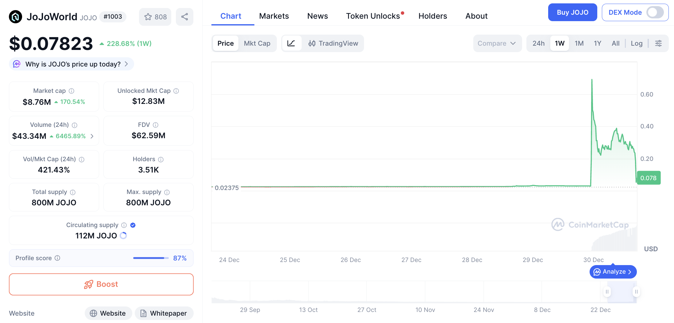 Dalam 24 jam, harga JOJO melonjak 205.03% dan dalam 7 hari mencatatkan kenaikan hingga 269.34%. Token ini diperdagangkan di harga $0.08776 dengan volume transaksi harian mencapai $41,635,462 dan circulating supply sebesar 523.43 juta token.