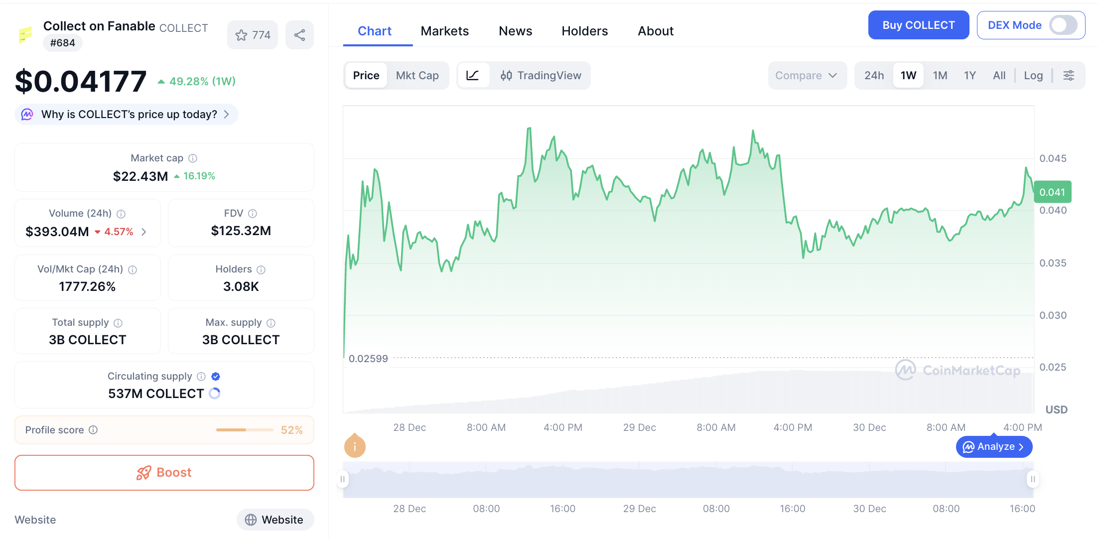 Posisi kedua ditempati oleh Collect on Fanable (COLLECT). Token ini memiliki kapitalisasi pasar sebesar $22,648,787 dengan harga $0.04217. Secara performa, COLLECT mencatatkan kenaikan 13.56% dalam 24 jam dan 50.72% dalam 7 hari terakhir.