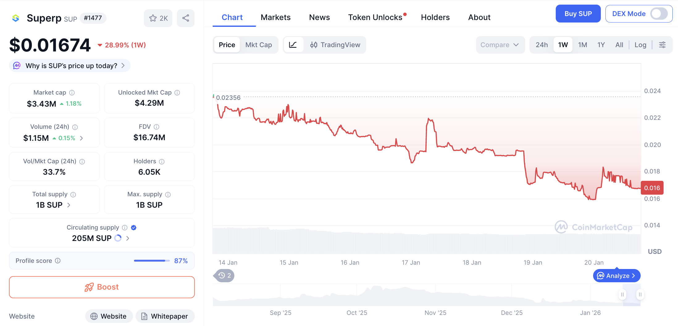 Dalam kurun 7 hari, SUP mengalami kenaikan harga sebesar 29.40%, mendekati performa mingguan TITN. Volume perdagangan 24 jam mencapai $1,157,022, dengan suplai beredar sebanyak 69.11 juta SUP. Kenaikan tajam ini menempatkan SUP sebagai salah satu token CMC Labs yang paling diperhatikan dalam sepekan terakhir.