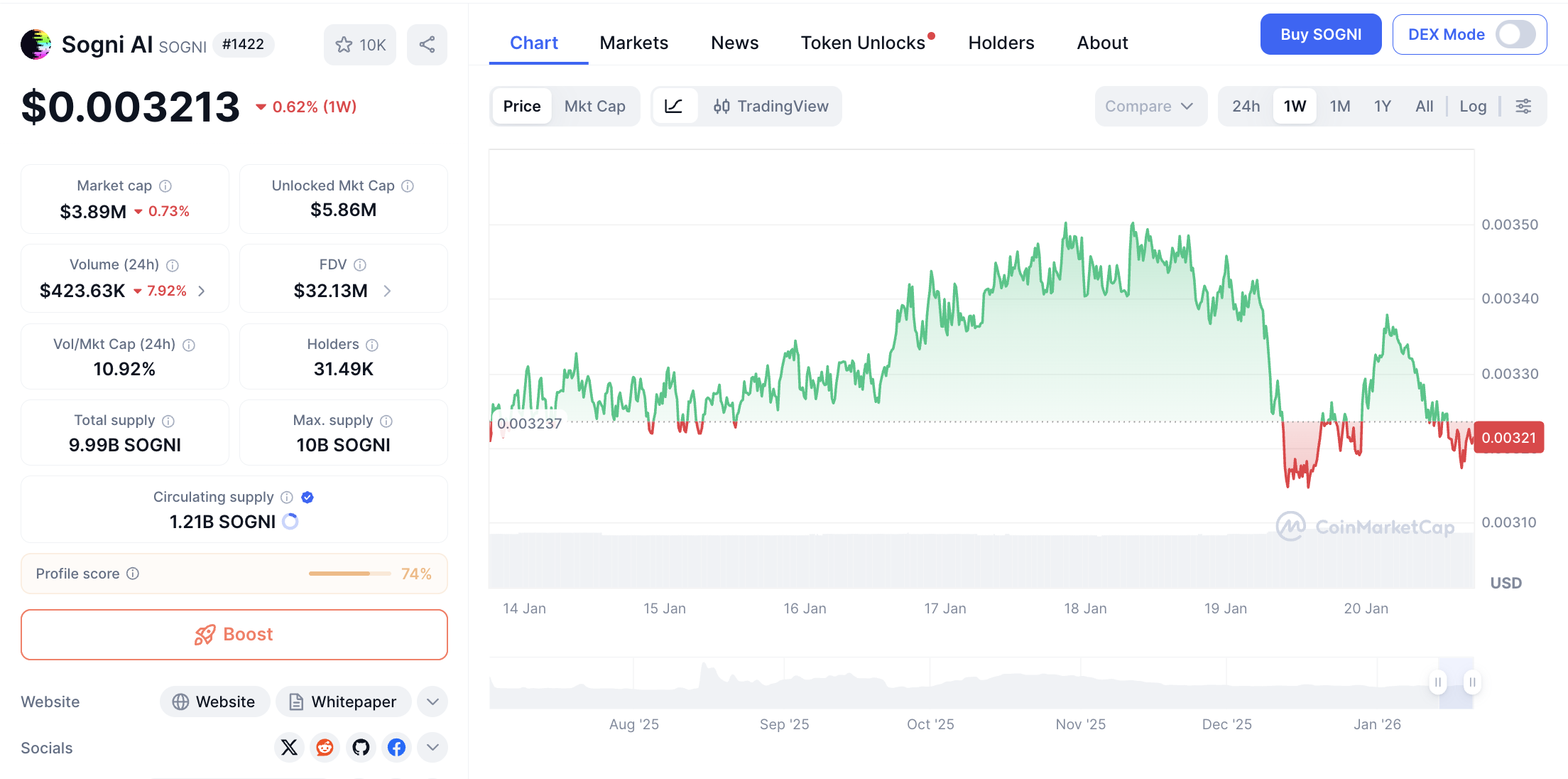 Token ini mencatatkan pertumbuhan 1.25% dalam 7 hari terakhir, dengan volume perdagangan harian mencapai $425,207. Total suplai beredar SOGNI tercatat sebanyak 133.42 juta token. Stabilitas pergerakan harga SOGNI menunjukkan konsistensi minat investor meski tanpa lonjakan ekstrem.