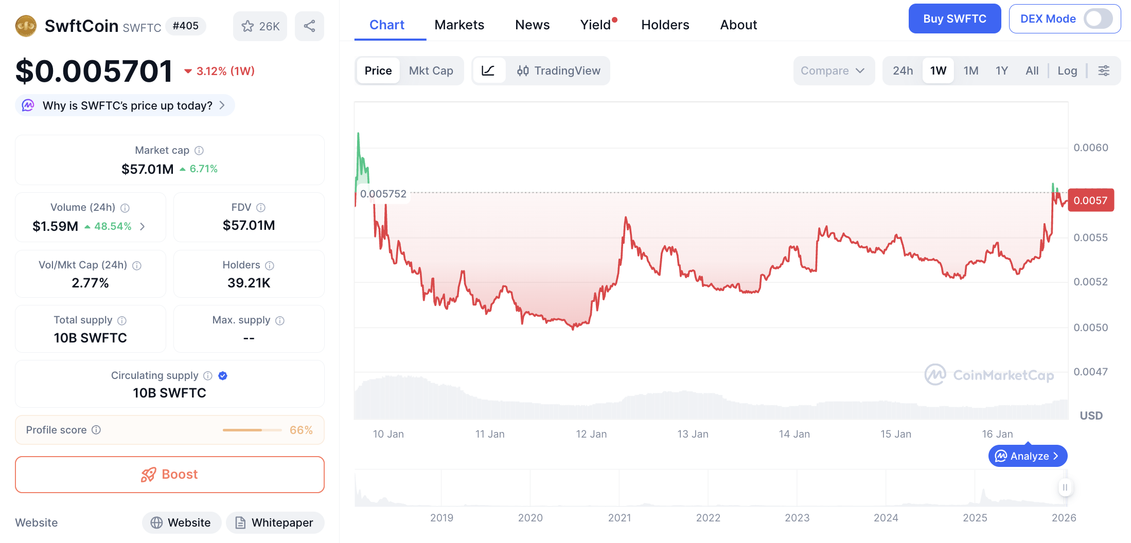 Kapitalisasi pasar SWFTC berada di level $56,975,542 dengan volume transaksi 24 jam sebesar $1,592,453. Jumlah suplai beredar tercatat 279.35M token dari total suplai maksimal 10B SWFTC.
