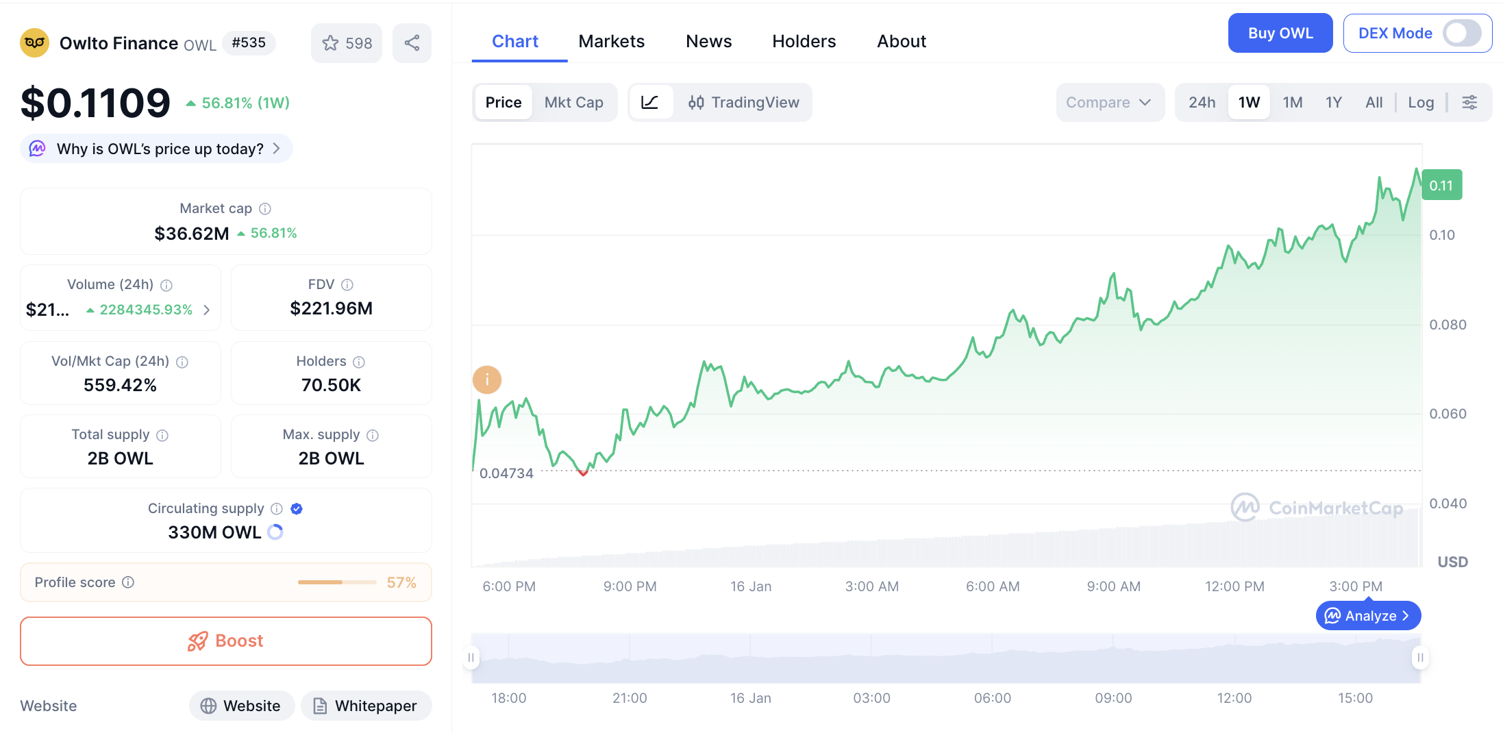 Kapitalisasi pasar OWL tercatat sebesar $38,136,304 dengan volume transaksi harian mencapai $212,244,946. Jumlah suplai beredar berada di angka 330,000,000 OWL dari total 1.96B token. Lonjakan volume menunjukkan adanya peningkatan minat pasar yang signifikan terhadap proyek ini.