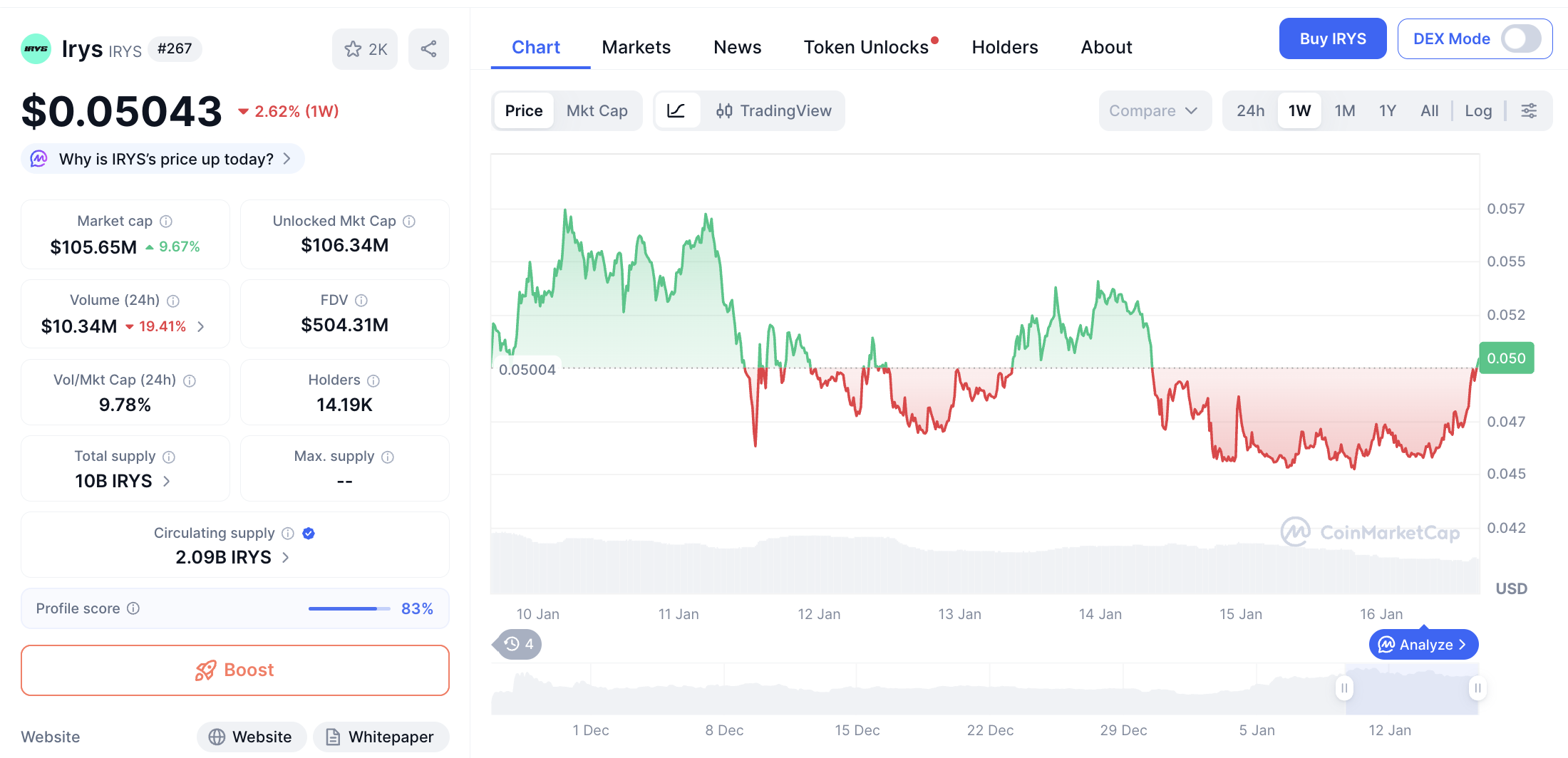 Kapitalisasi pasar IRYS mencapai $105,183,149 dengan volume transaksi harian sebesar $10,284,748. Saat ini terdapat 204.03M IRYS yang beredar dari total suplai 2.09B token. Pergerakan harga IRYS tergolong stabil dengan likuiditas yang kuat.