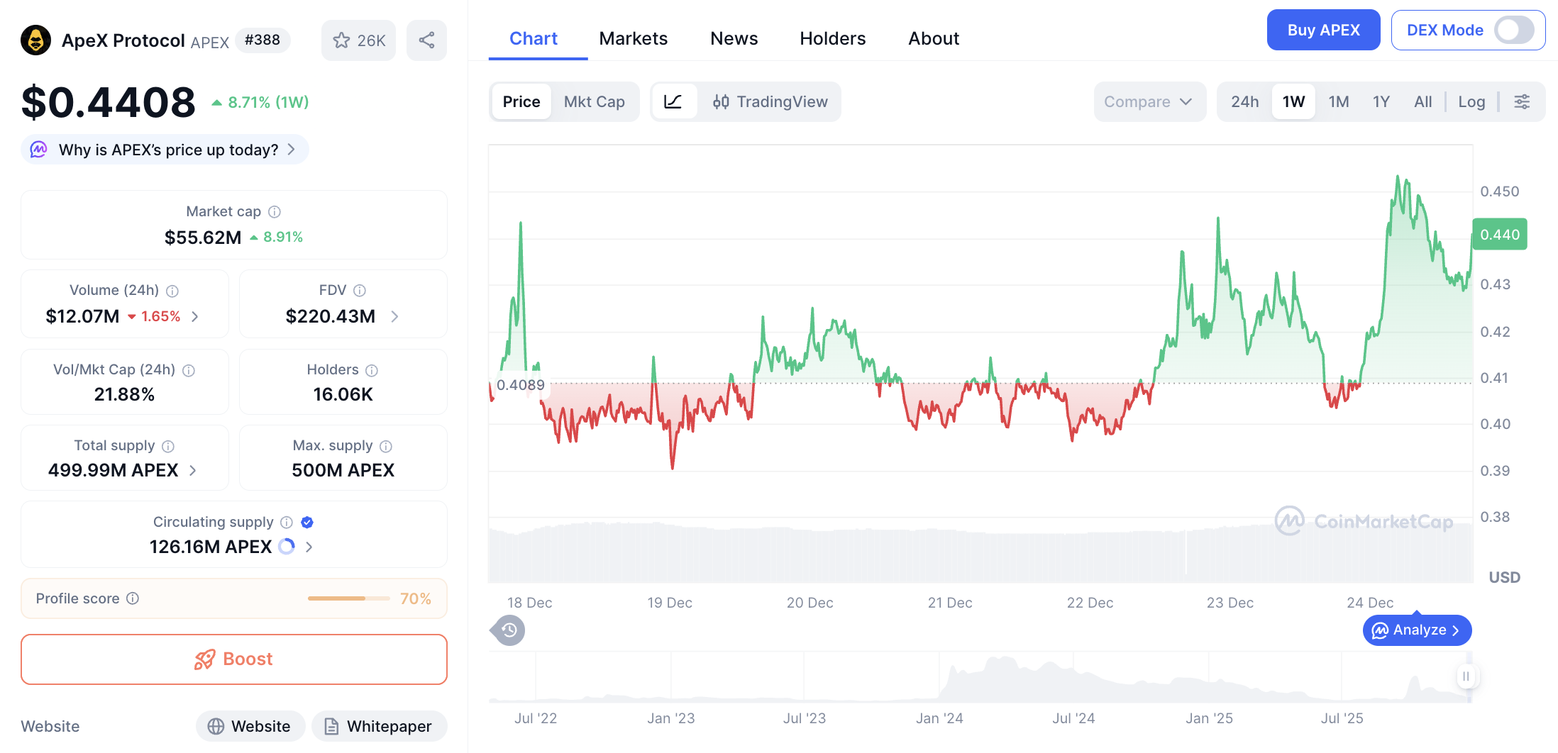 Di posisi berikutnya, ApeX Protocol (APEX) mencatatkan kapitalisasi pasar sebesar $54.90 juta. Harga APEX berada di kisaran $0.4351, dengan kenaikan 7.88% dalam 24 jam dan 7.41% dalam 7 hari.
