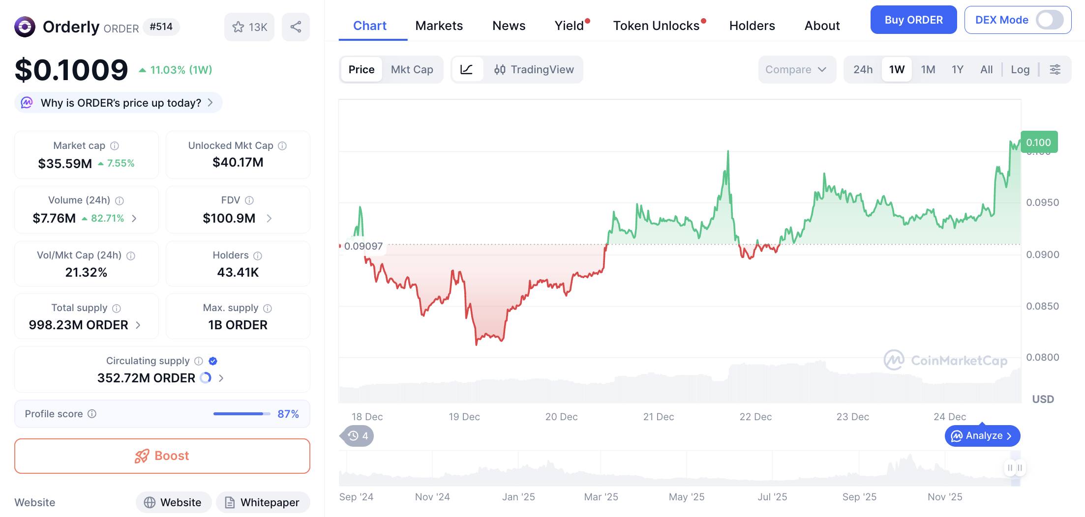 Orderly (ORDER) masuk dalam daftar 3 besar Perp DEX coin dengan kapitalisasi pasar $35.55 juta. Token ini diperdagangkan di harga $0.1007, naik 7.42% dalam 24 jam dan 10.96% dalam 7 hari terakhir.