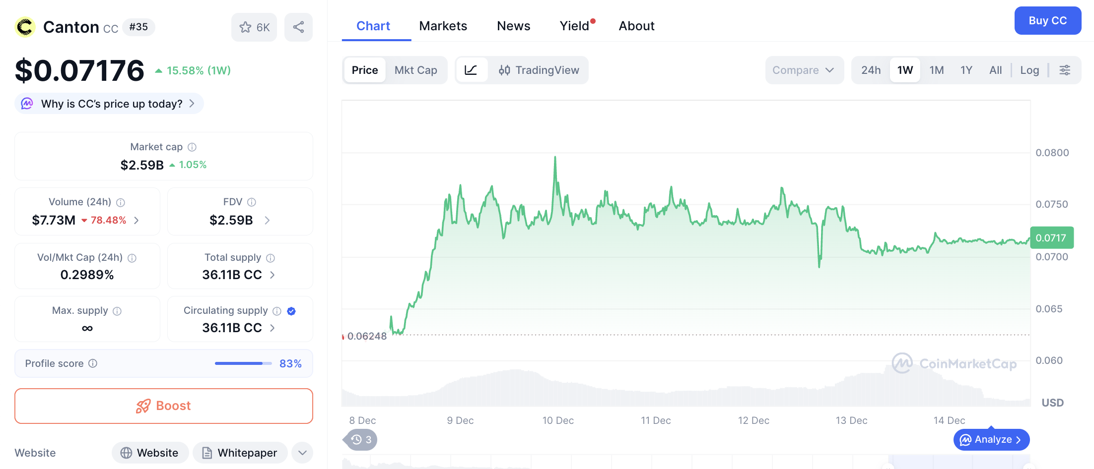 Volume perdagangan 24 jam CC tercatat sebesar $7,765,738 dengan suplai beredar 36.11B CC. Kinerja ini menempatkan Canton sebagai pemain dominan di sektor privacy blockchain.