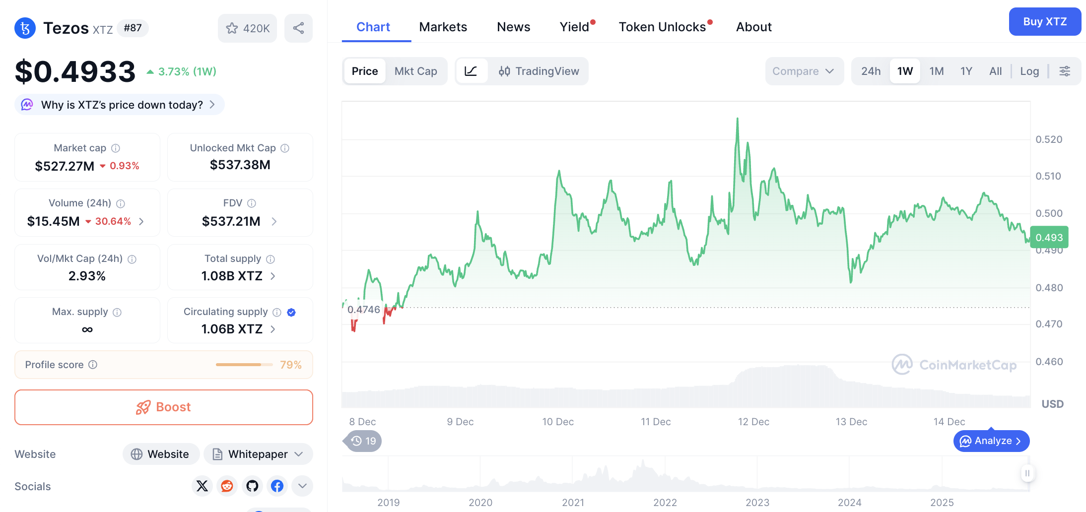 Volume transaksi harian XTZ mencapai $15,458,934 dengan suplai beredar sekitar 1.06B XTZ. Tezos masih menjadi salah satu blockchain yang konsisten digunakan untuk solusi privasi dan smart contract.