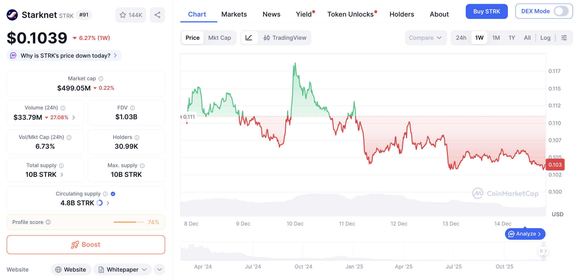 Volume perdagangan 24 jam tercatat $33,630,378, dengan suplai beredar mencapai 4.8B STRK. Starknet terus menarik perhatian sebagai solusi privacy dan scaling berbasis zero-knowledge.