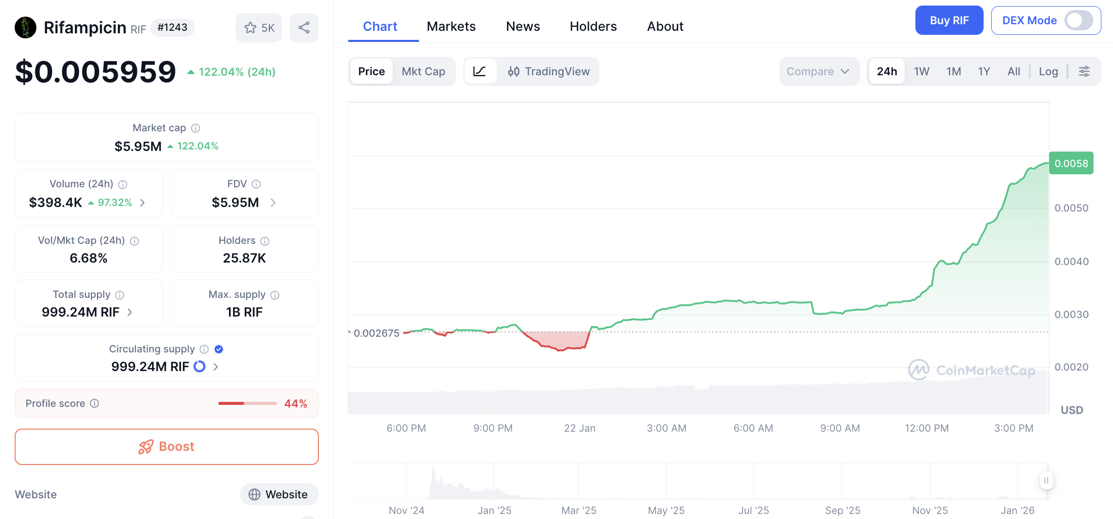 Rifampicin (RIF) mencatatkan kenaikan tertinggi. Token ini diperdagangkan di level US$0,005829 dengan lonjakan 117,80% dalam 24 jam dan 158,75% dalam tujuh hari terakhir.