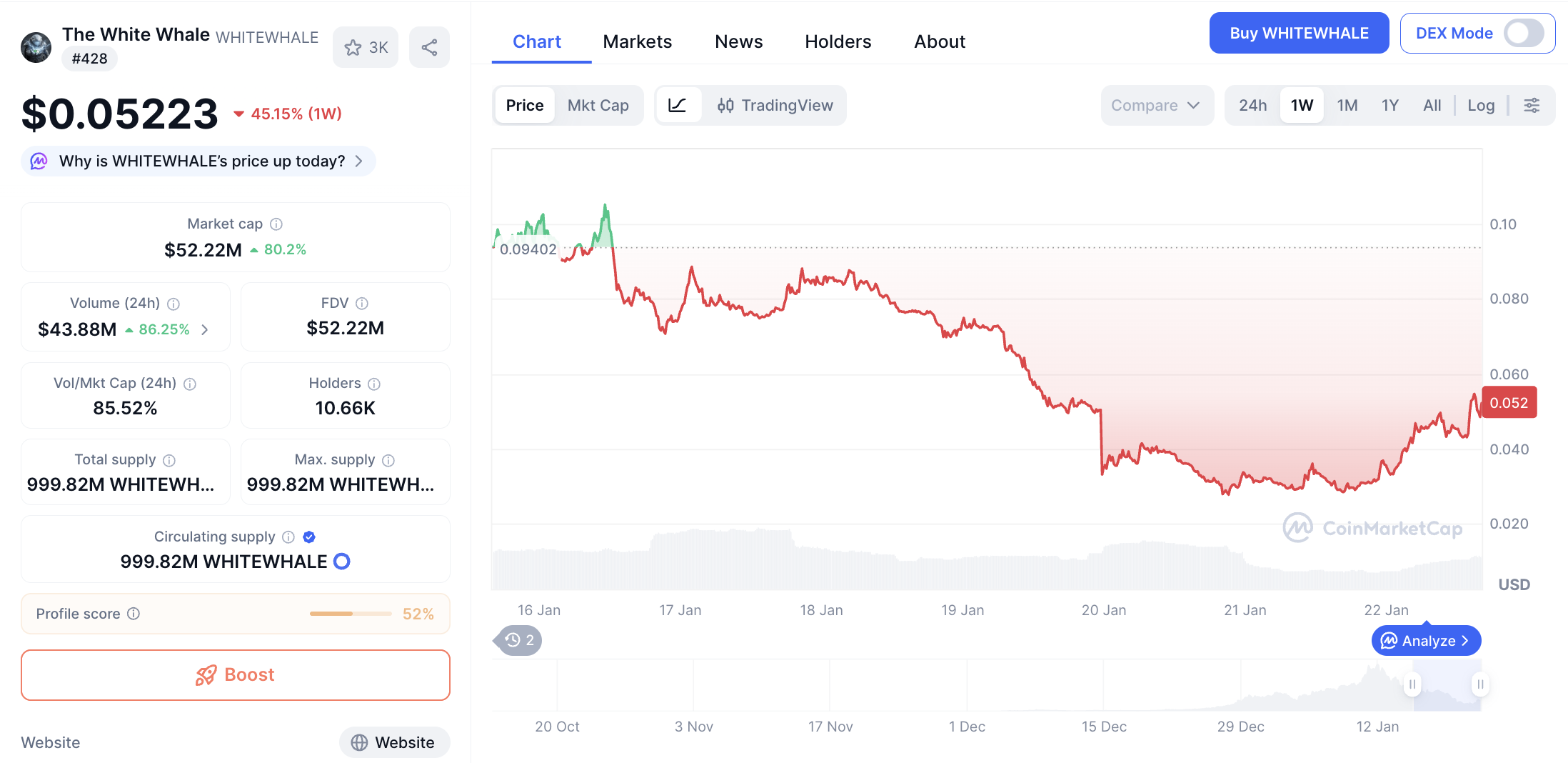 Kapitalisasi pasarnya menyentuh US$49,44 juta dengan volume perdagangan harian yang sangat tinggi, mencapai US$42,95 juta. Saat ini, jumlah token yang beredar berada di angka 868,57 juta WHITEWHALE.