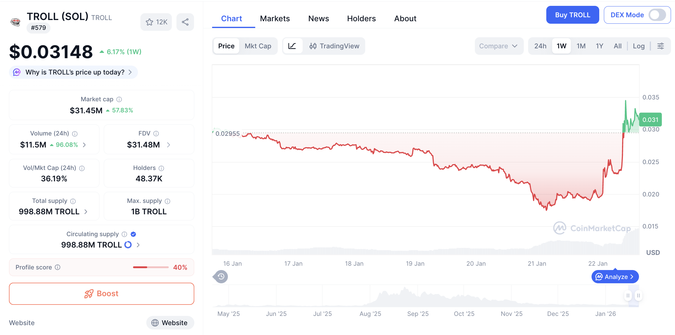 Kapitalisasi pasar TROLL tercatat sebesar US$31,84 juta dengan volume transaksi harian US$11,53 juta. Jumlah token yang beredar mencapai 358,90 juta dari total suplai hampir 1 miliar token.