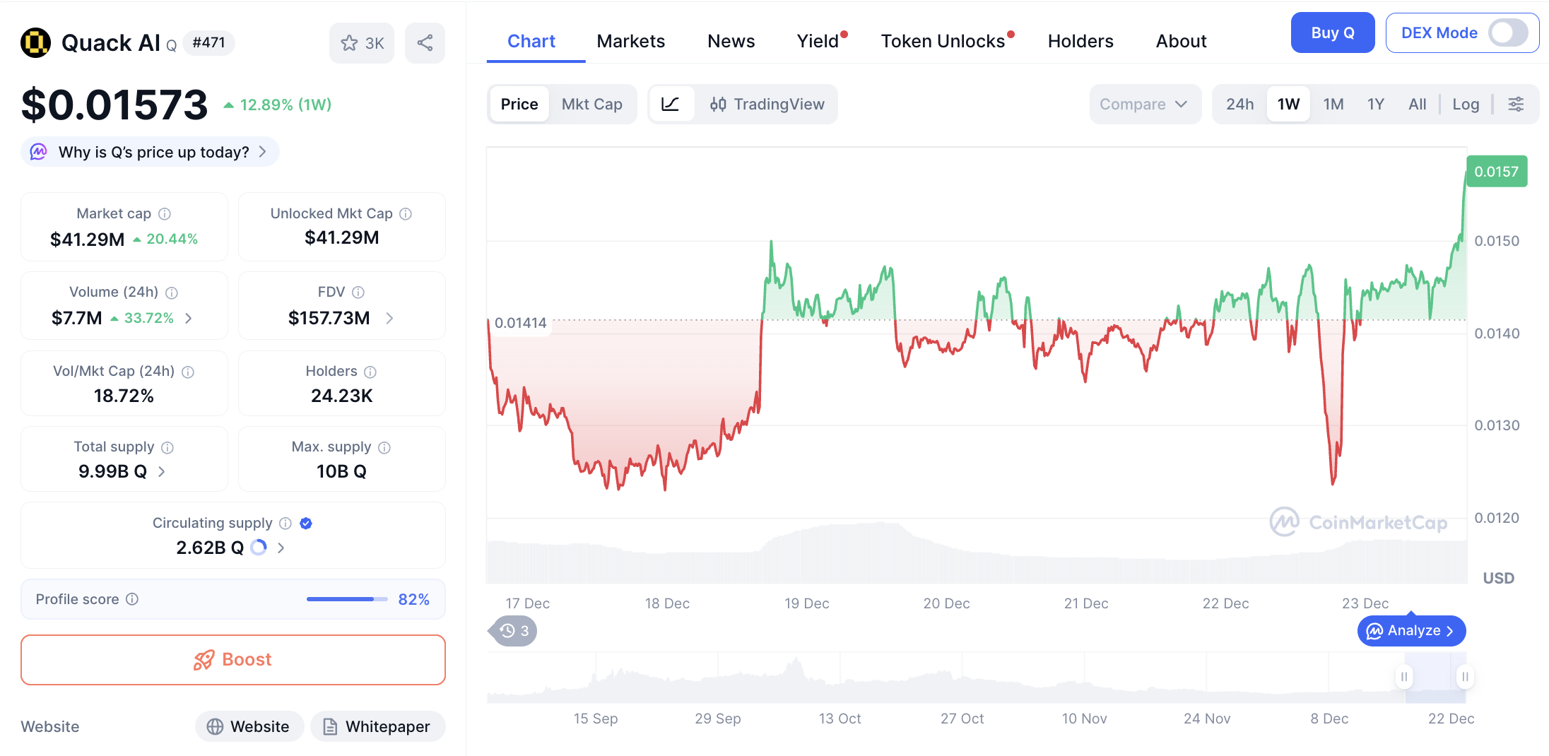 Quack AI (Q) menjadi token terbesar di ekosistem x402 dengan kapitalisasi pasar mencapai $40,778,278. Harga Q tercatat di level $0.01554.