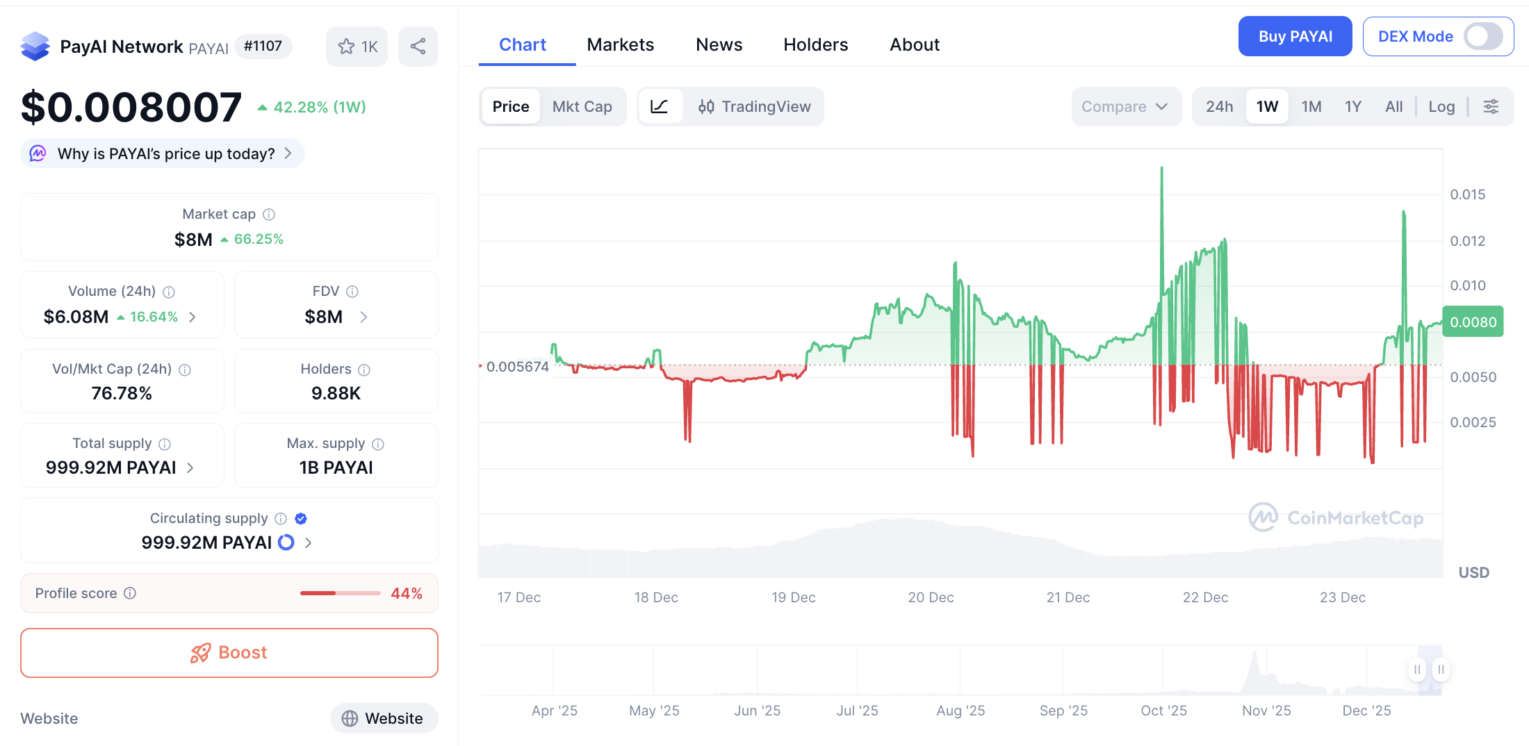 Token ini memiliki suplai beredar 999.92M PAYAI, menjadikannya salah satu aset paling aktif diperdagangkan di x402 ecosystem.