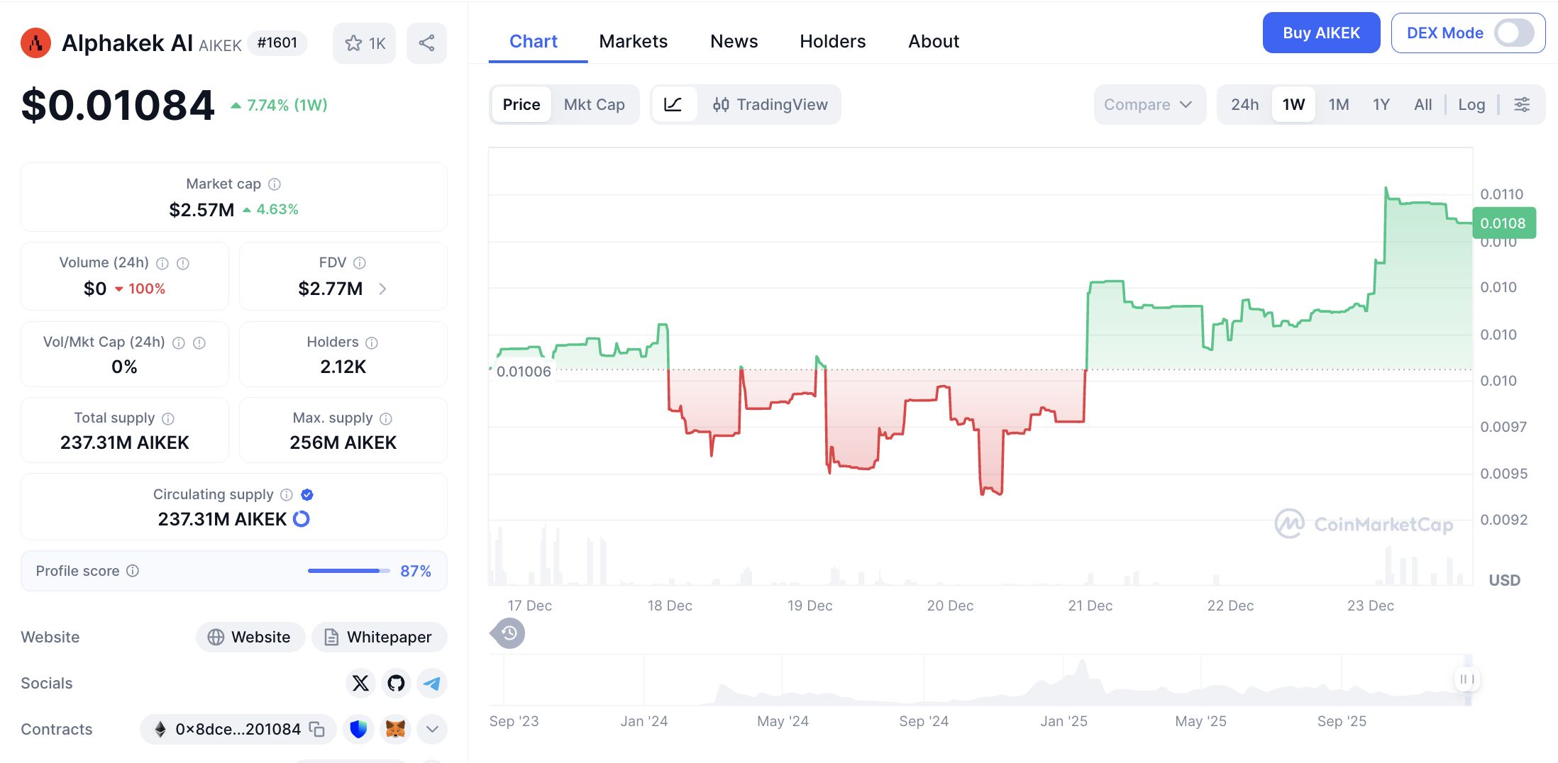 Dalam 24 jam terakhir, AIKEK naik 4.66%, sementara dalam 7 hari terakhir menguat 7.76%. Total suplai beredar tercatat sebanyak 237.31M AIKEK.