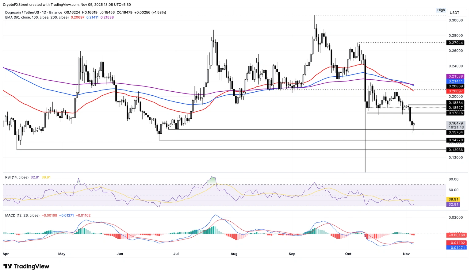 Secara teknikal, kondisi Dogecoin semakin mengkhawatirkan. Pola Death Cross, di mana rata-rata pergerakan 100 hari (100 EMA) memotong ke bawah rata-rata 200 hari (200 EMA), baru saja terbentuk, memperkuat sinyal tren bearish yang kuat.