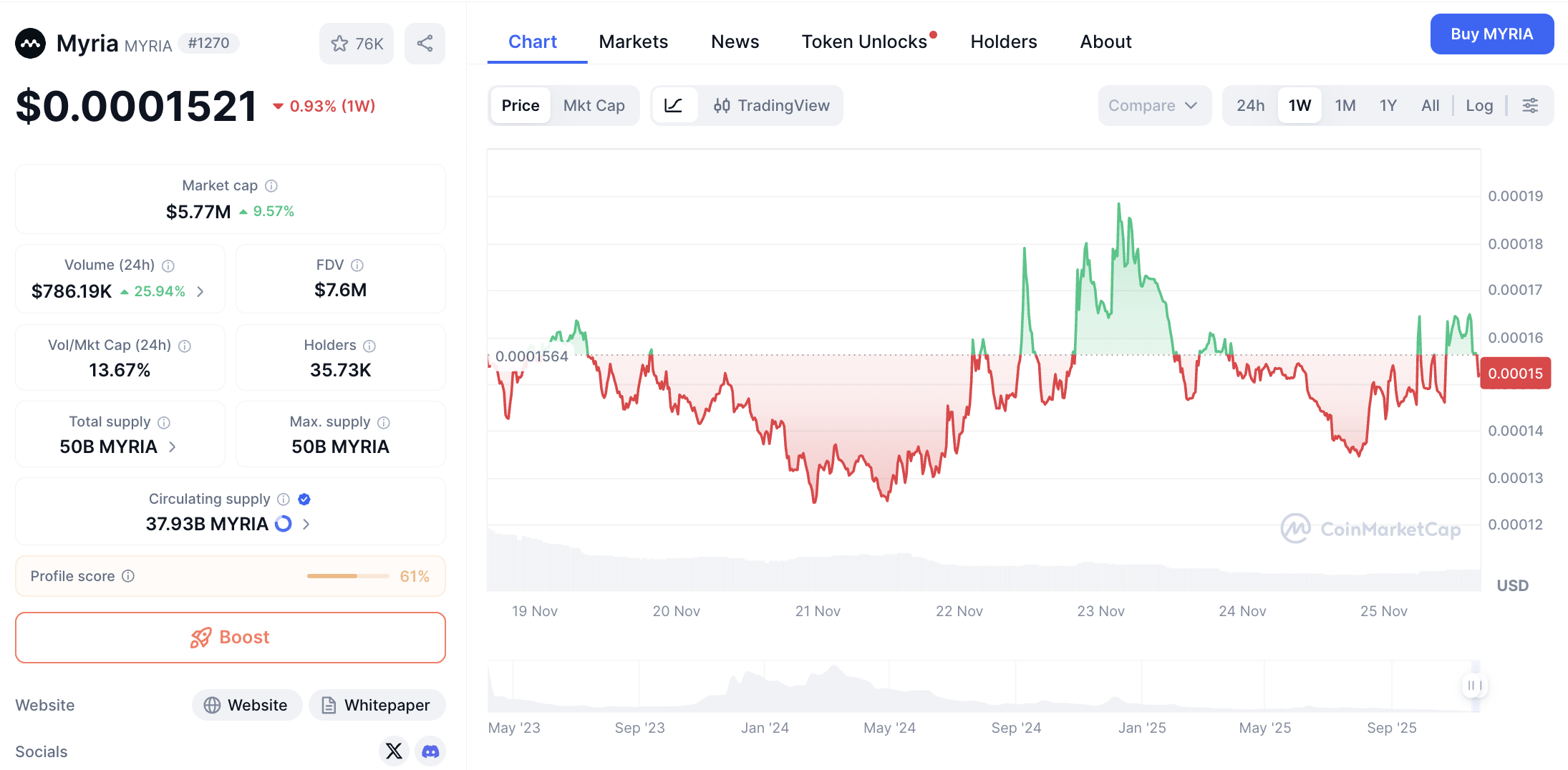 Sebagai jaringan Layer-2 untuk game Web3, Myria menawarkan biaya rendah dan skalabilitas tinggi. Kenaikan harga dalam 24 jam mencerminkan meningkatnya aktivitas ekosistem gaming yang tengah berkembang.