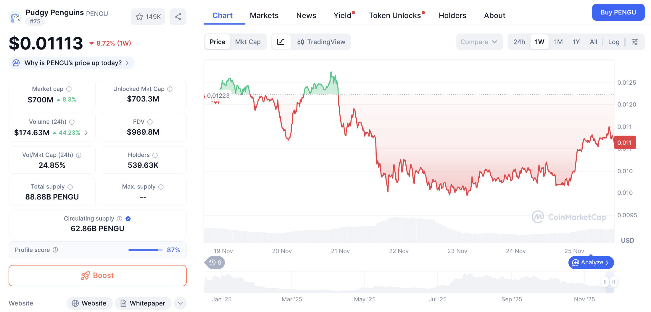 Dengan kapitalisasi pasar terbesar di antara token lainnya, PENGU menjadi penguasa sektor NFT saat ini. Volume transaksi yang besar menunjukkan bahwa komunitas Pudgy Penguins tetap kuat dan terus berkembang.