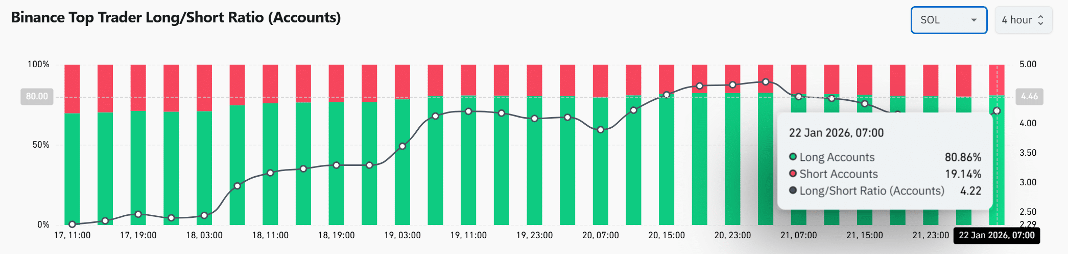 Data posisi trader teratas di Binance menunjukkan sentimen tetap condong ke arah bullish. Sebanyak 80,86% akun trader besar berada di posisi long, sementara hanya 19,14% yang mengambil posisi short. Rasio long/short tercatat di 4,22, menandakan eksposur long lebih dari empat kali lipat dibanding short.