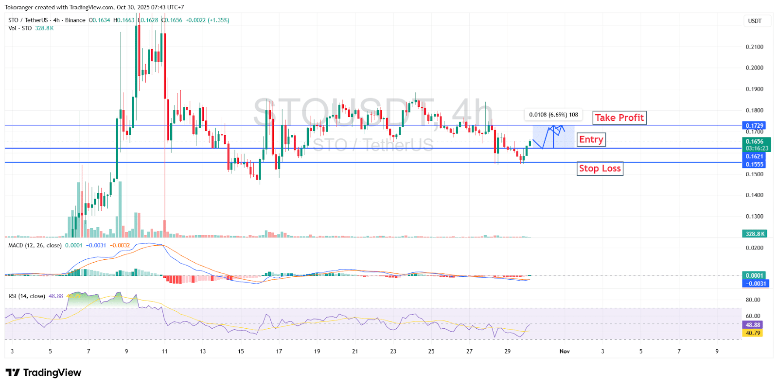 STO/USDT sedang berada dalam fase pemulihan harga (price rebound) setelah menyentuh area support kuat di $0.1555-$0.1621, dengan potensi kenaikan menuju $0.1729 atau sekitar +6.7%. Struktur candle menunjukkan buyer mulai kembali aktif, diperkuat oleh RSI di level 49.7 yang keluar dari zona jenuh jual dan MACD yang mulai melengkung ke atas menandakan potensi golden cross dalam waktu dekat. Volume yang perlahan meningkat juga memberi sinyal adanya minat beli baru.