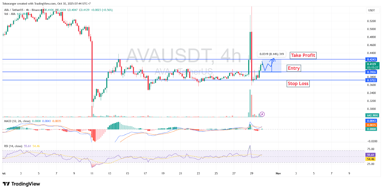 AVA/USDT saat ini tengah membentuk pola retest sehat setelah lonjakan volume besar, menandakan bahwa pasar sedang menguji kekuatan buyer di area $0.39-$0.41 sebelum melanjutkan potensi kenaikan menuju $0.424 (+8.14%).