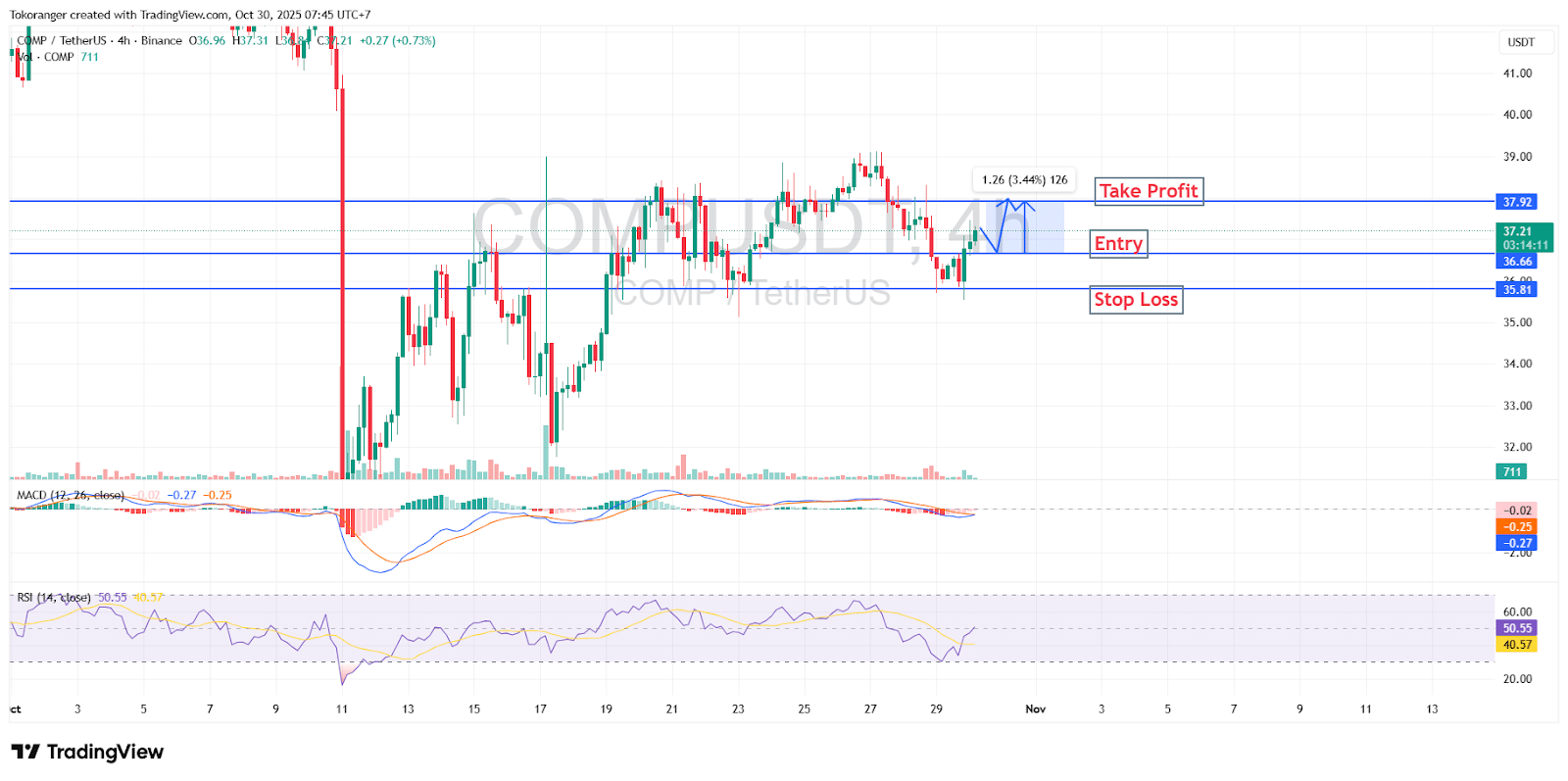 COMP/USDT terlihat sedang melakukan pantulan teknikal (technical rebound) dari area support kuat di sekitar $35.81 – $36.66, menandakan buyer mulai kembali aktif setelah tekanan jual sebelumnya mereda. Target kenaikan terdekat berada di $37.92 (+3.44%), yang berpotensi tercapai jika harga mampu bertahan di atas area entry. RSI kini berada di level 50, mengindikasikan momentum netral dengan peluang untuk bergerak ke zona bullish, sementara MACD mulai menunjukkan perpotongan positif yang menandakan potensi reversal halus.