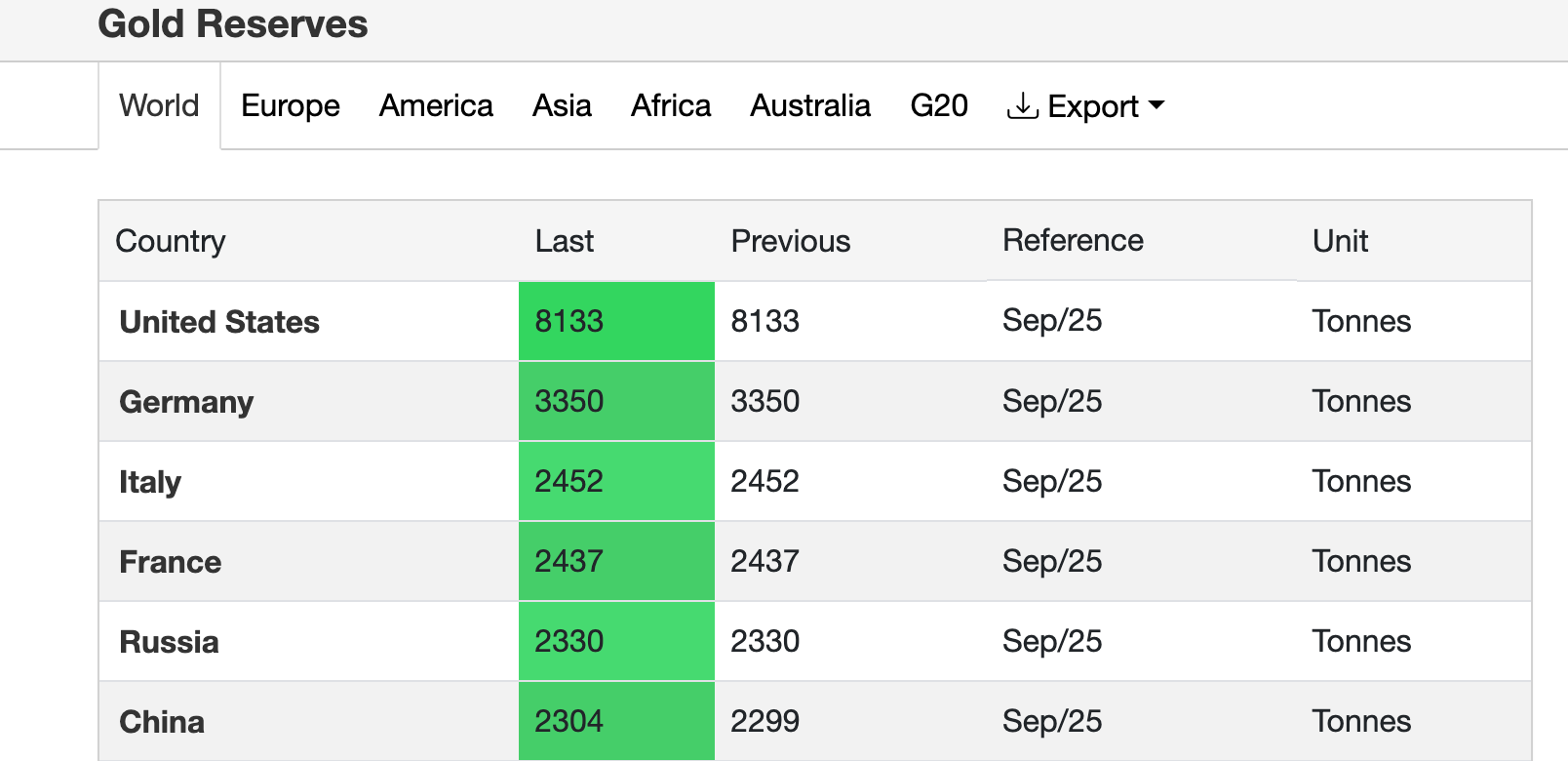 Cadangan emas resmi China mencapai 2.304 ton pada kuartal III 2025, menyumbang 7,7% dari cadangan devisanya dan menandai pembelian bulanan ke-11 berturut-turut pada September (menambahkan 1,2 ton). People’s Bank of China (PBoC) menambahkan 5 ton pada kuartal III, bagian dari tren sejak 2023 di tengah reli harga emas hingga $3.508 per ons.
