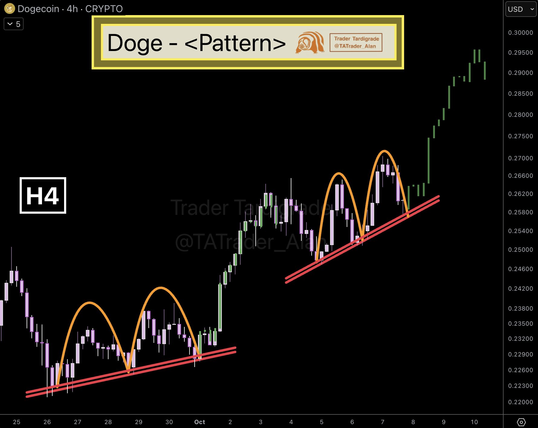 Menurut analis kripto di platform X, Trader Tardigrade, grafik 4 jam Dogecoin menunjukkan pola yang menyerupai formasi bullish, dengan dua kali upaya reli yang gagal namun tetap membentuk garis tren naik (ascending trendline). Pola ini, katanya, sangat mirip dengan pergerakan DOGE akhir September lalu, tepat sebelum harga melonjak hingga 18%.