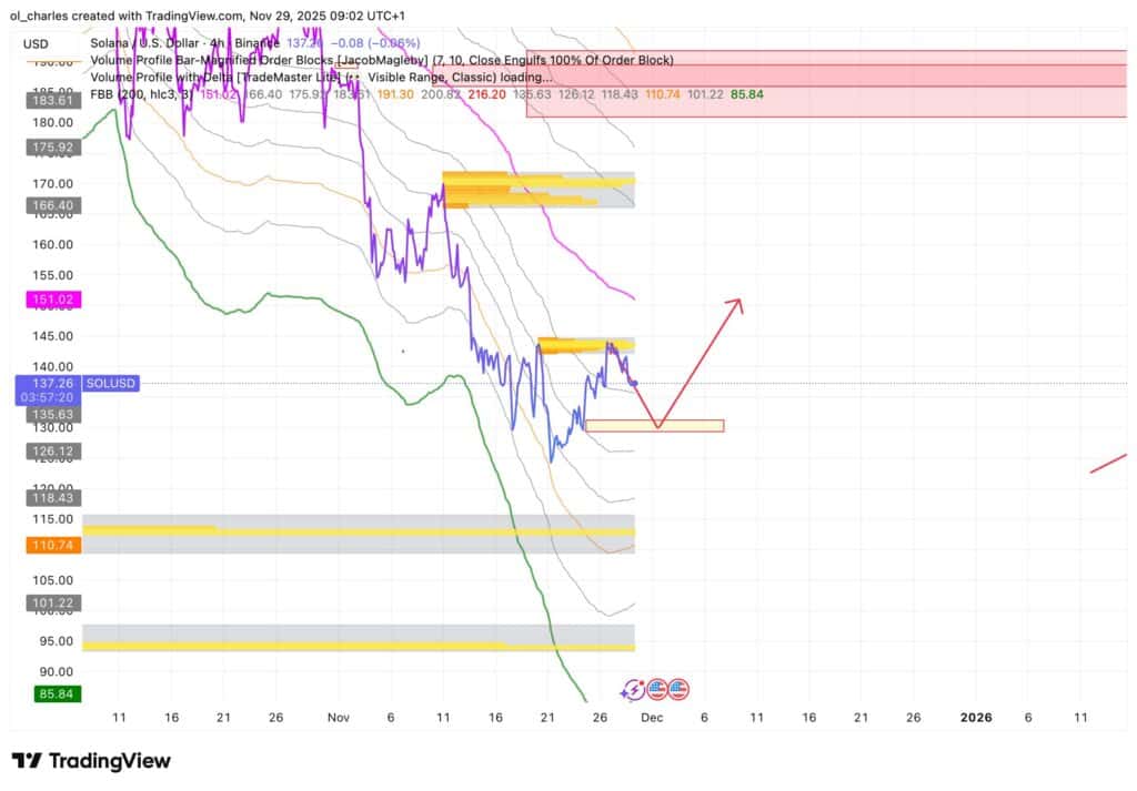 Sebelum mengincar target tersebut, SOL masih perlu menembus Order Block 4 jam di level 145 dolar. Sebelum itu terjadi, harga berpotensi melakukan retracement ke Order Block 128 hingga 130 dolar sebelum mencoba kembali menembus level tersebut.