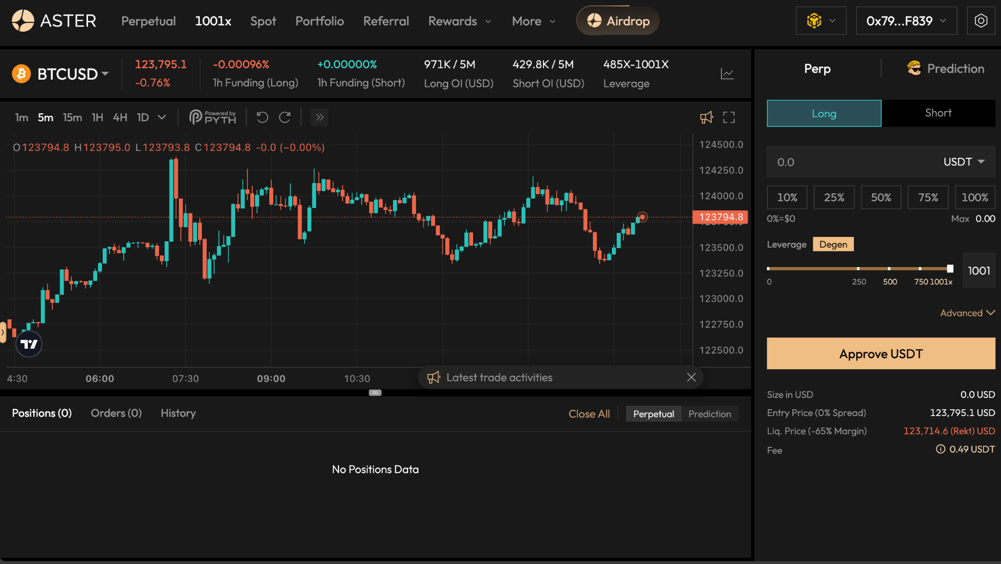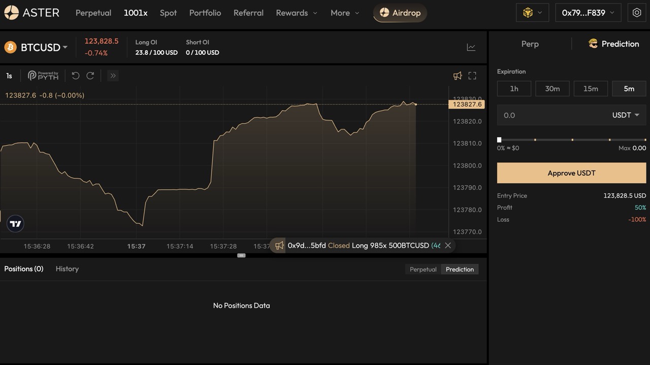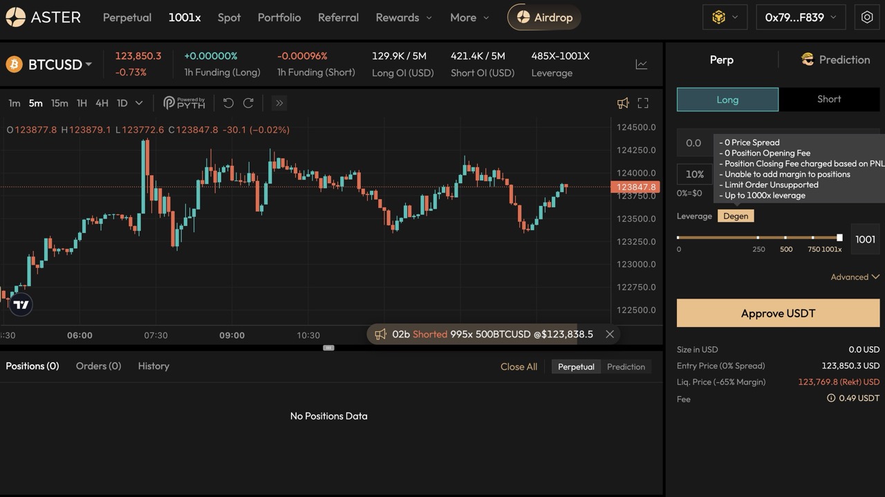 Aster membedakan dirinya dengan menyediakan opsi leverage hingga 1001x, salah satu tertinggi di industri DEX saat ini. Dalam fitur 1001x leverage ini, kamu bisa memilih untuk trading menggunakan fitur perpetual atau prediction. Cocok untuk para degen yang memiliki profile risiko trading yang tinggi.
