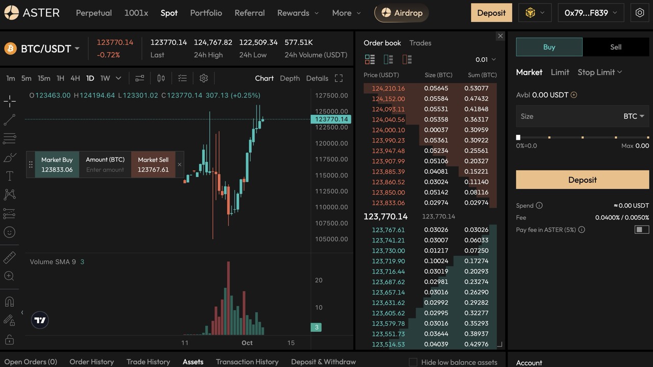 Aster menghadirkan pengalaman spot trading yang modern dan efisien, memungkinkan pengguna membeli dan menjual aset kripto secara langsung dengan harga pasar terbaik. Fitur spot trading pada Aster menggunakan antarmuka order book dengan likuiditas tinggi, biaya perdagangan yang sangat rendah, dan beragam tools trading.