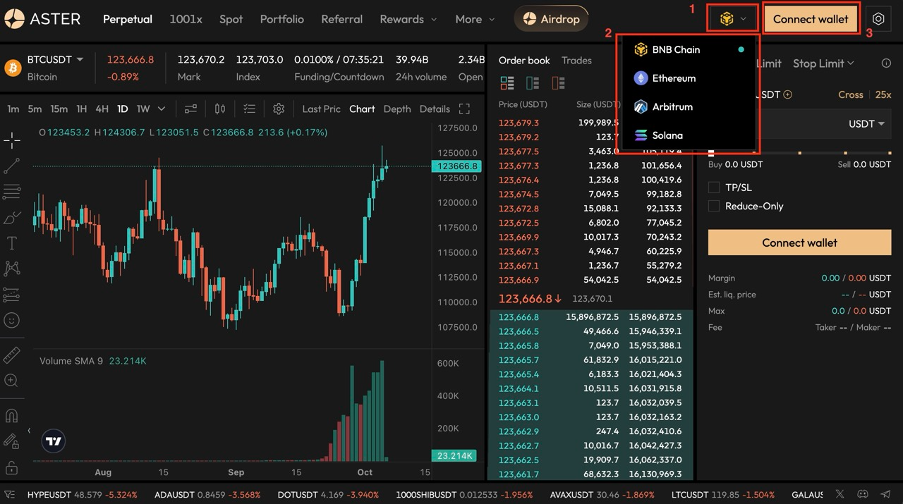 Sebelum kamu mencoba menggunakan Aster, pastikan kamu telah memiliki aset kripto yang ada di jaringan yang didukung oleh Aster, seperti jaringan BNB Chain, Ethereum, Arbitrum dan Solana. Aset tersebut bisa berupa stablecoin, atau native token dari masing-masing jaringan tersebut.
