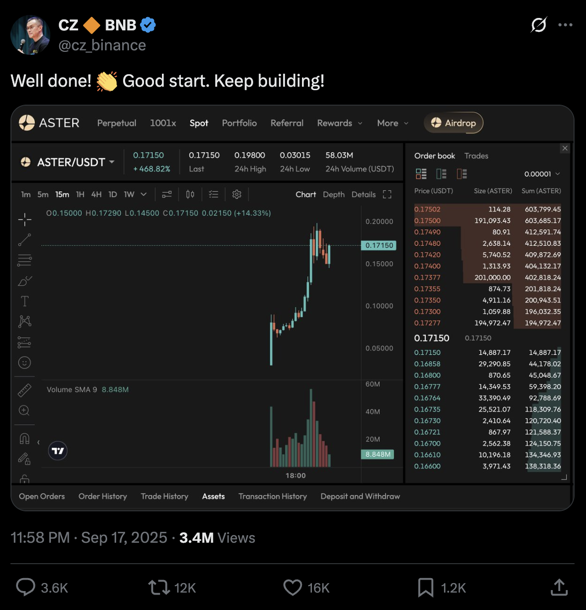 Changpeng Zhao (CZ), pendiri Binance, secara terang-terangan mendukung perkembangan Aster melalui akun pribadi X (Twitter) miliknya pada tanggal 17 September 2025, sebelum Aster listing di bursa pasar besar.