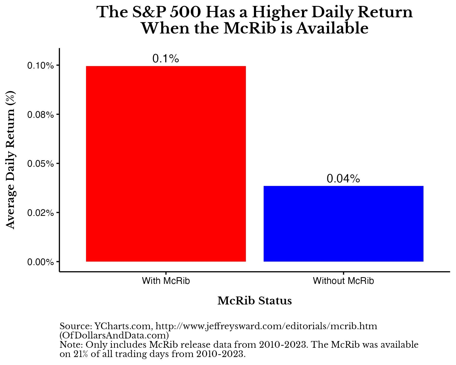Menurut Nick Maggiulli, antara tahun 2010 hingga 2023, pasar saham Amerika (S&P 500) mencatat rata-rata imbal hasil harian sebesar 0,1% ketika McRib tersedia, dibandingkan dengan 0,04% pada hari-hari ketika menu tersebut tidak tersedia.