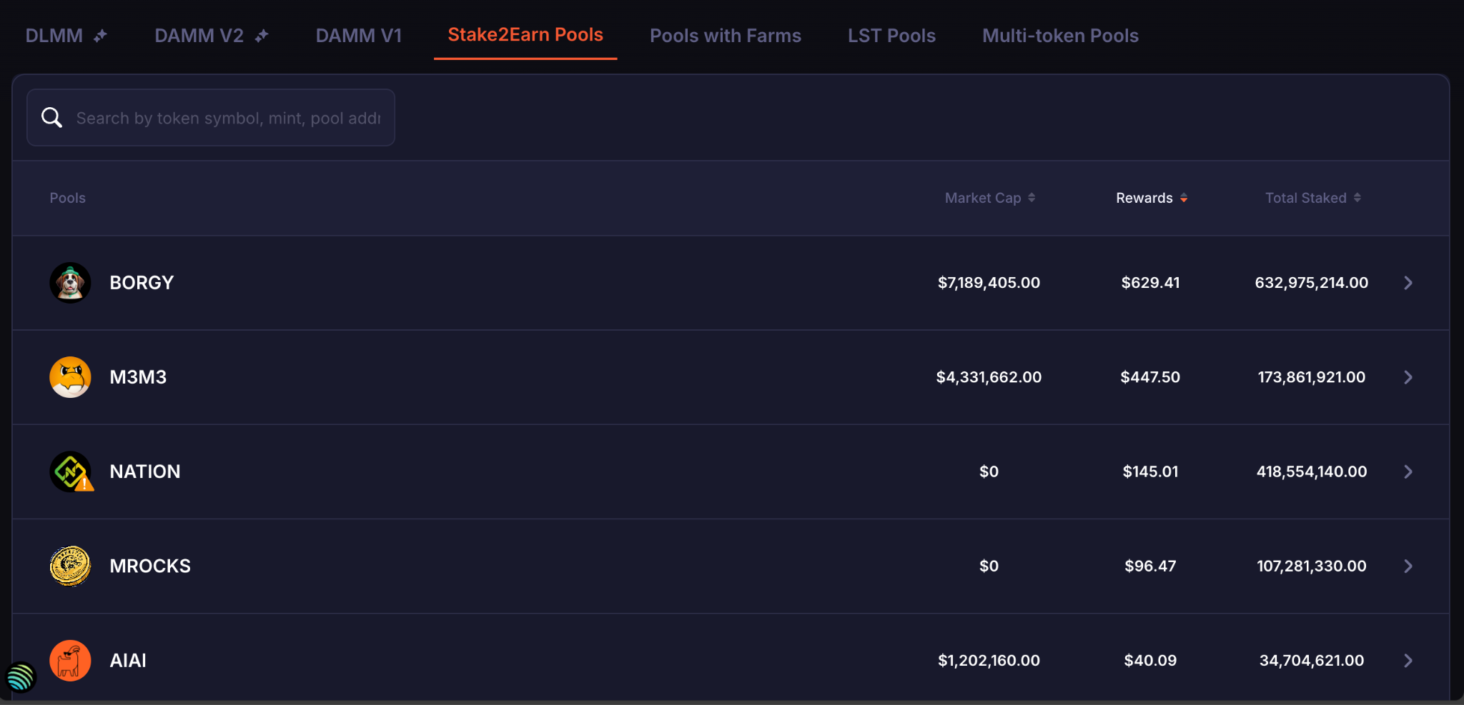 Stake2Earn adalah fitur yang memungkinkan pemilik memecoin mendapatkan bagian dari trading fees yang dihasilkan oleh pool DAMM v1, khususnya bagi para top stakers.