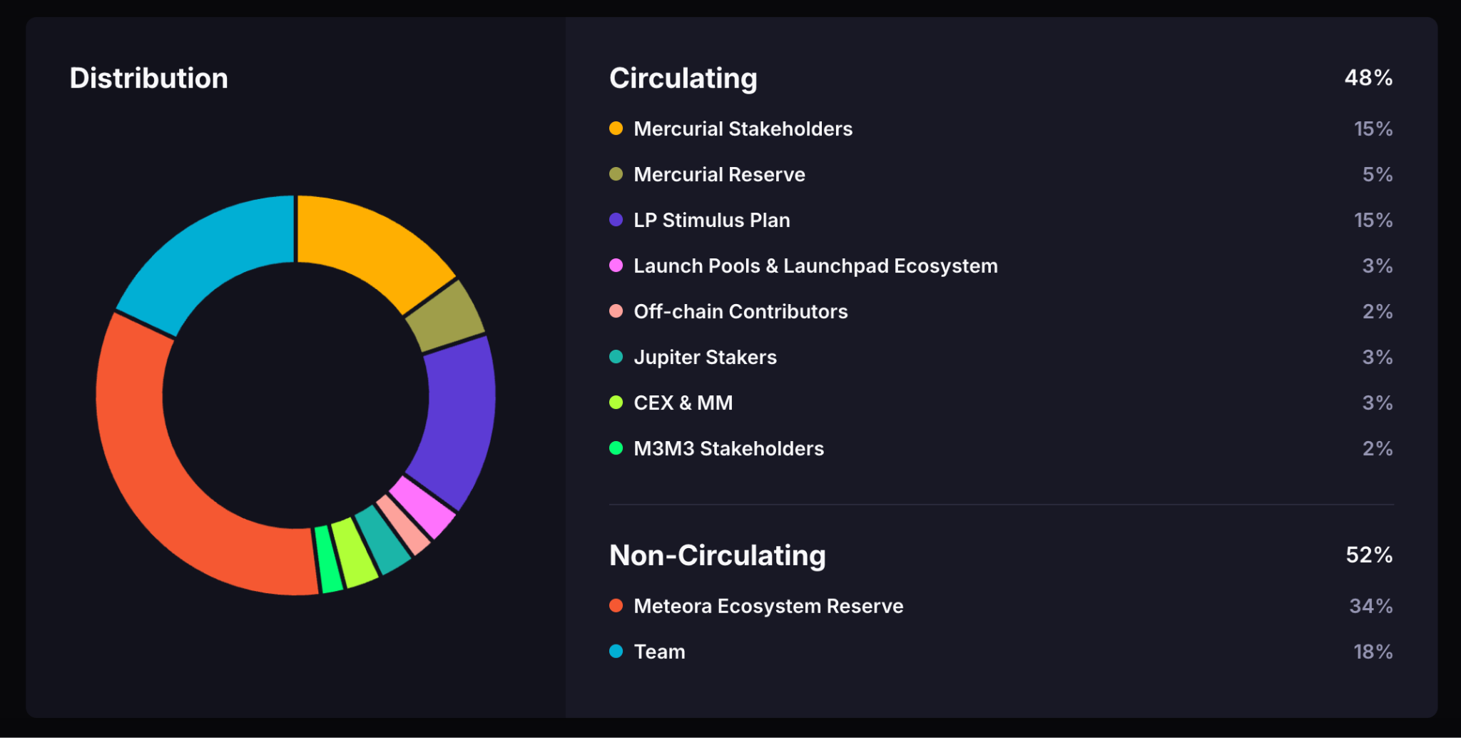 Token MET merupakan token native dari ekosistem Meteora yang baru saja melewati fase Token Generation Event (TGE) pada tanggal 23 Oktober 2025. Dengan alokasi tokenimcs sebagai berikut: