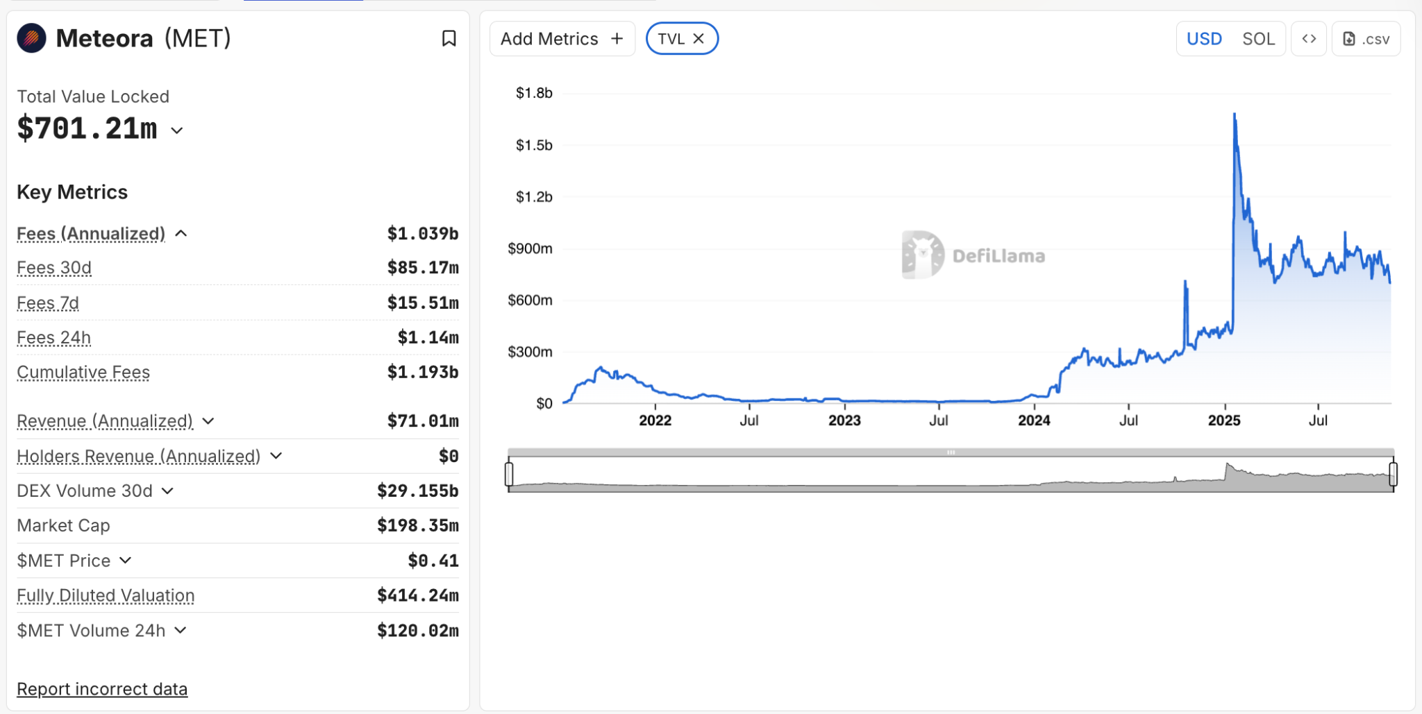 Secara metrik dari laman DefiLlama, Meteora menunjukkan pertumbuhan yang sangat kuat sebagai salah satu pusat likuiditas terbesar di Solana. TVL yang mencapai $701 juta memperlihatkan bahwa banyak aset pengguna terkunci di ekosistemnya, menandakan kepercayaan dan penggunaan yang tinggi.