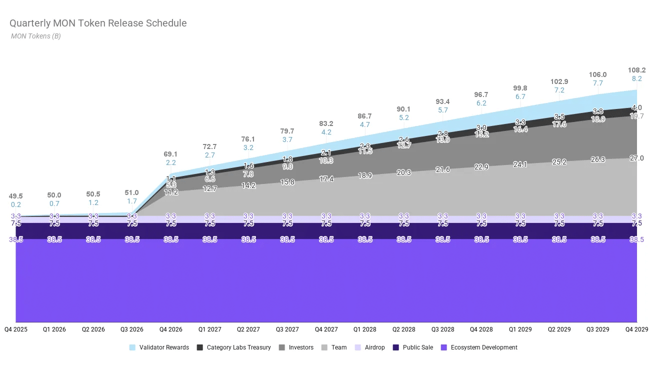 Pada peluncuran Monad Public Mainnet di November 2025, sekitar 49,4 miliar MON (49,4%) langsung terbuka (unlocked), terdiri dari distribusi publik sale, airdrop, dan alokasi pengembangan ekosistem. Sementara itu, 50,6 miliar MON (50,6%) masih terkunci, mencakup token tim, investor, serta Category Labs Treasury.