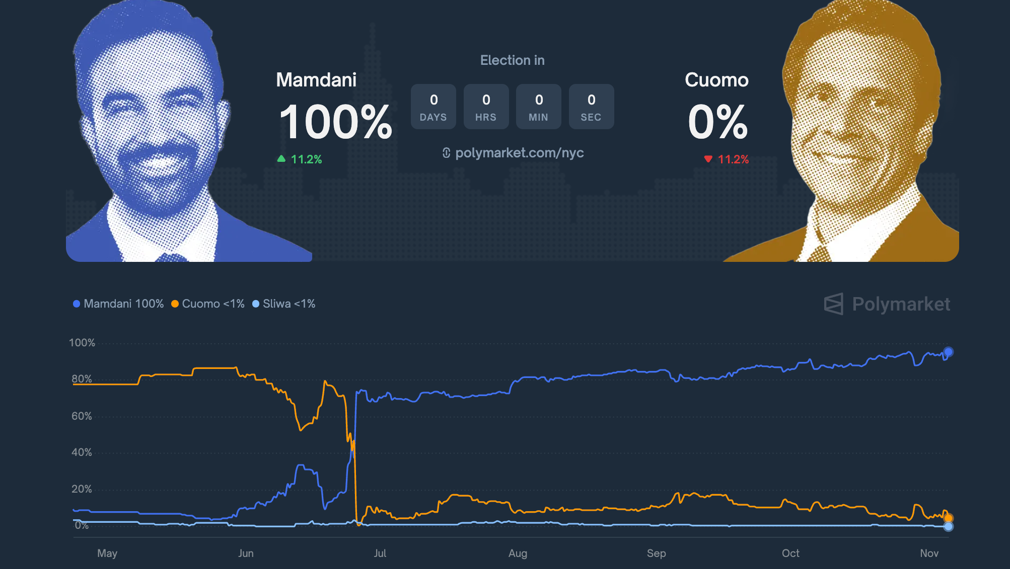 Jauh sebelum Zohran Mamdani ditetapkan sebagai Wali Kota terpilih, sejak akhir Juni 2025 platform Polymarket sudah memprediksi bahwa Zohran Mamdani memiliki peluang terpilih sebesar 73% dan angka ini terus meningkat hingga momen pemilihan berakhir.