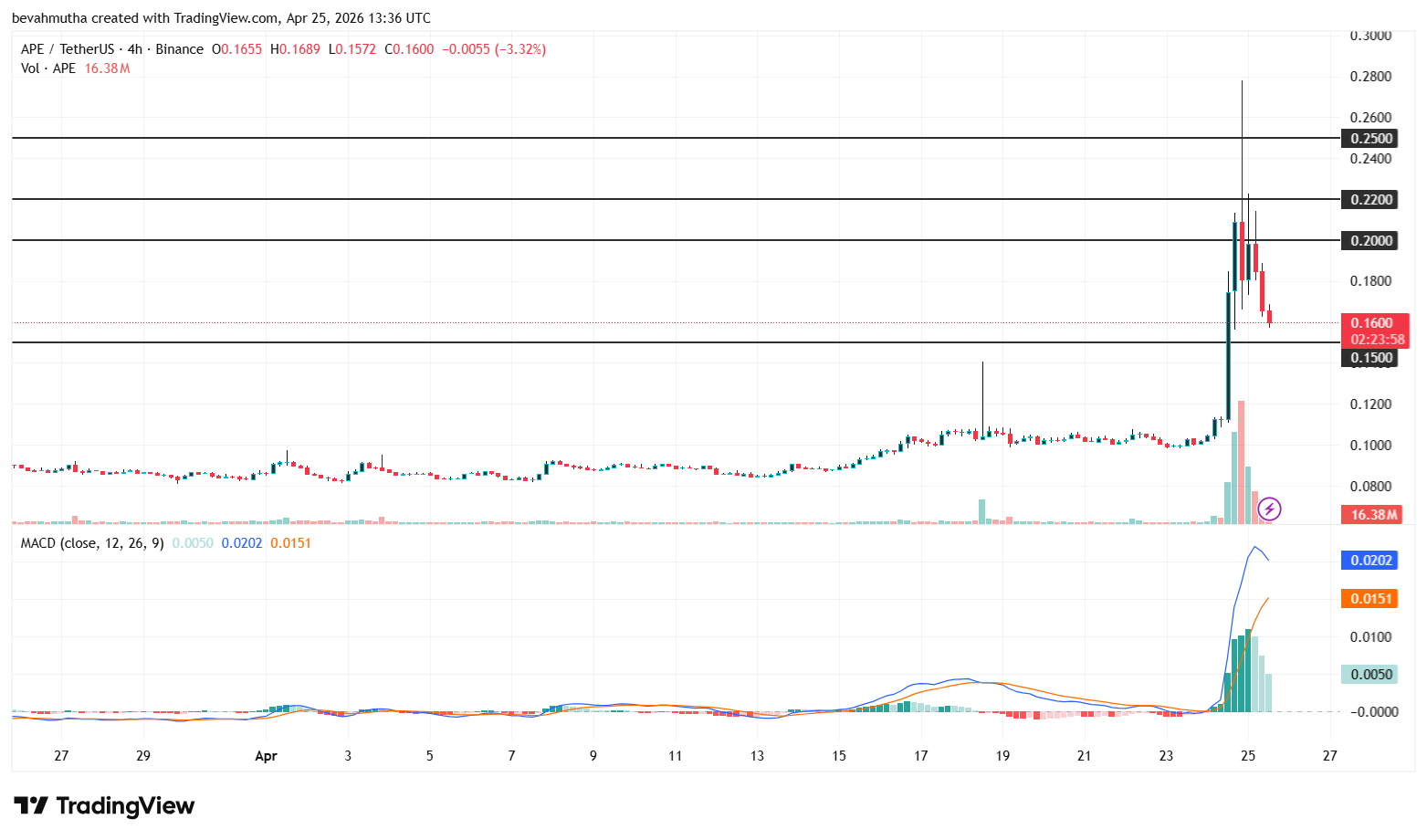 Secara teknikal, APE saat ini berada dalam fase penentuan setelah breakout dari tren turun jangka panjang. Level support utama berada di US$0,15, yang menjadi area penting untuk mempertahankan momentum bullish.