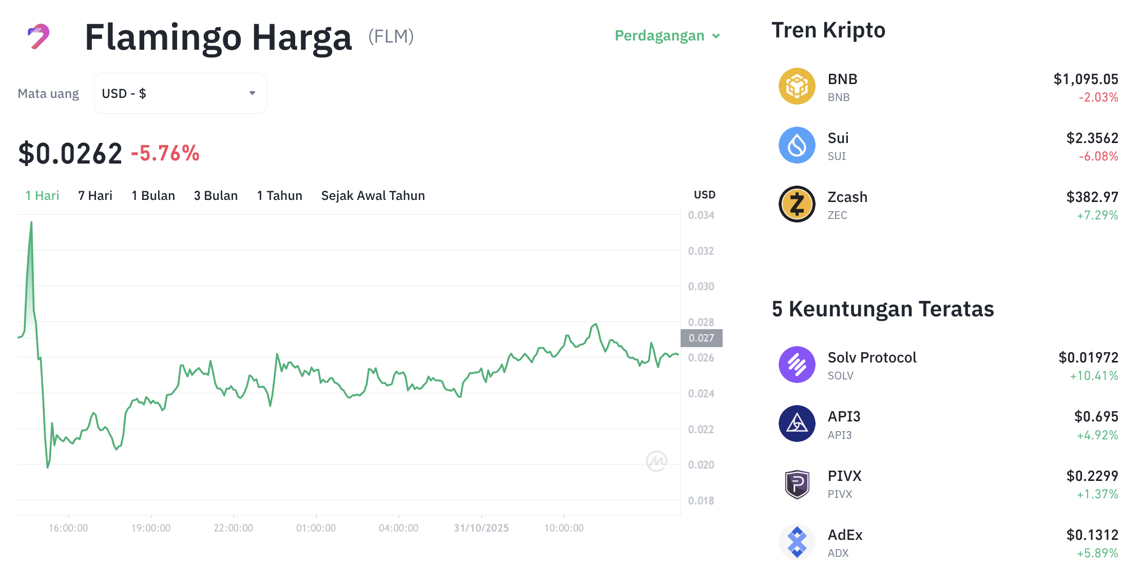 Dalam 24 jam terakhir, harga Flamingo melonjak 43,11% menjadi $0,026102 per token, menjadikannya salah satu aset digital f kenaikan tertinggi hari ini.