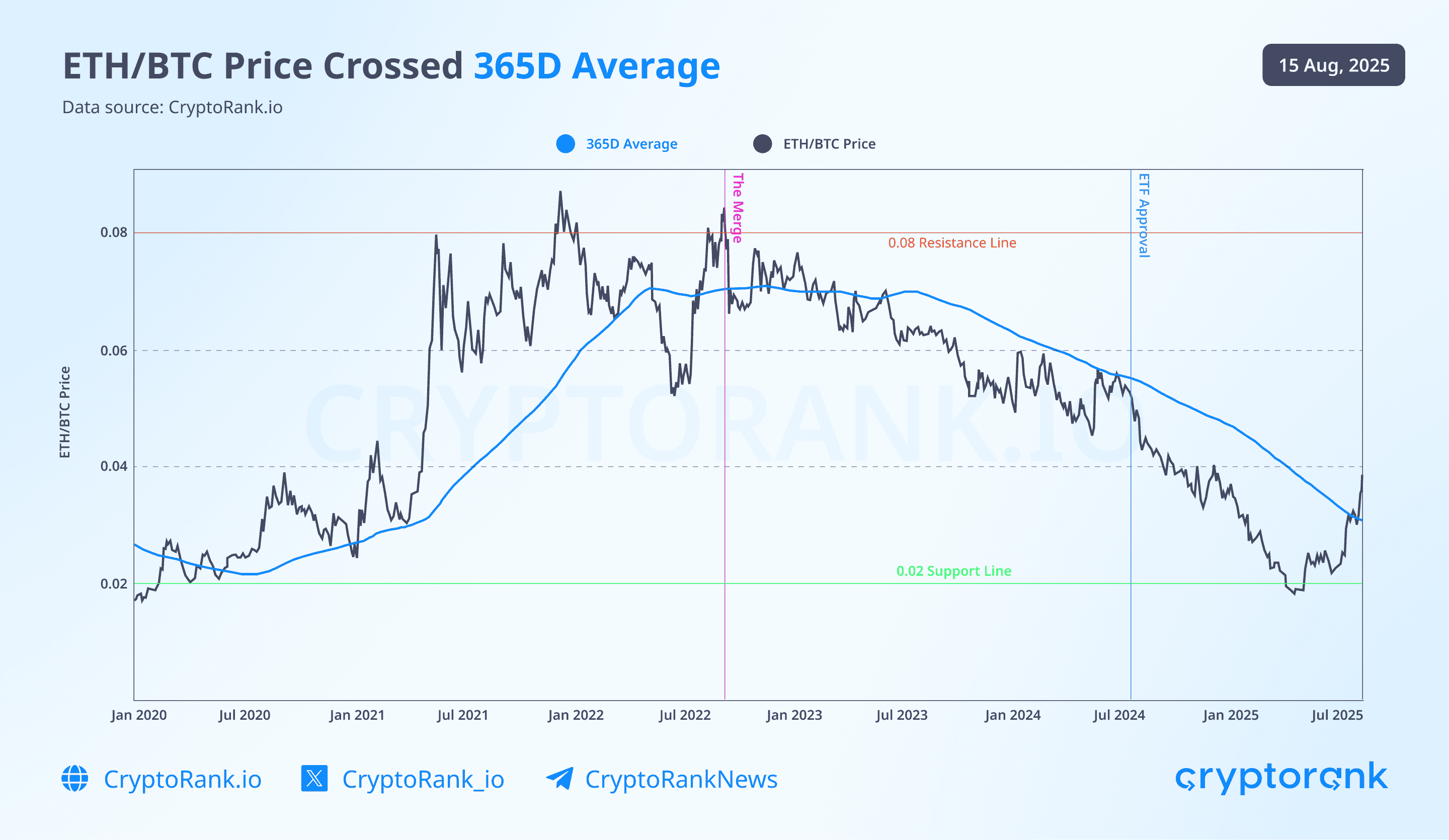 Tak mau kalah, Ethereum (ETH) juga mencetak rekor tertinggi baru berkat efek positif dari Genius dan Clarity Act yang memperjelas status hukum aset digital. ETF Ethereum mulai menyerap aliran modal institusional, sementara rasio ETH/BTC menembus level penting MA 365 hari—tanda kuat terjadinya rotasi modal dari Bitcoin menuju Ethereum.