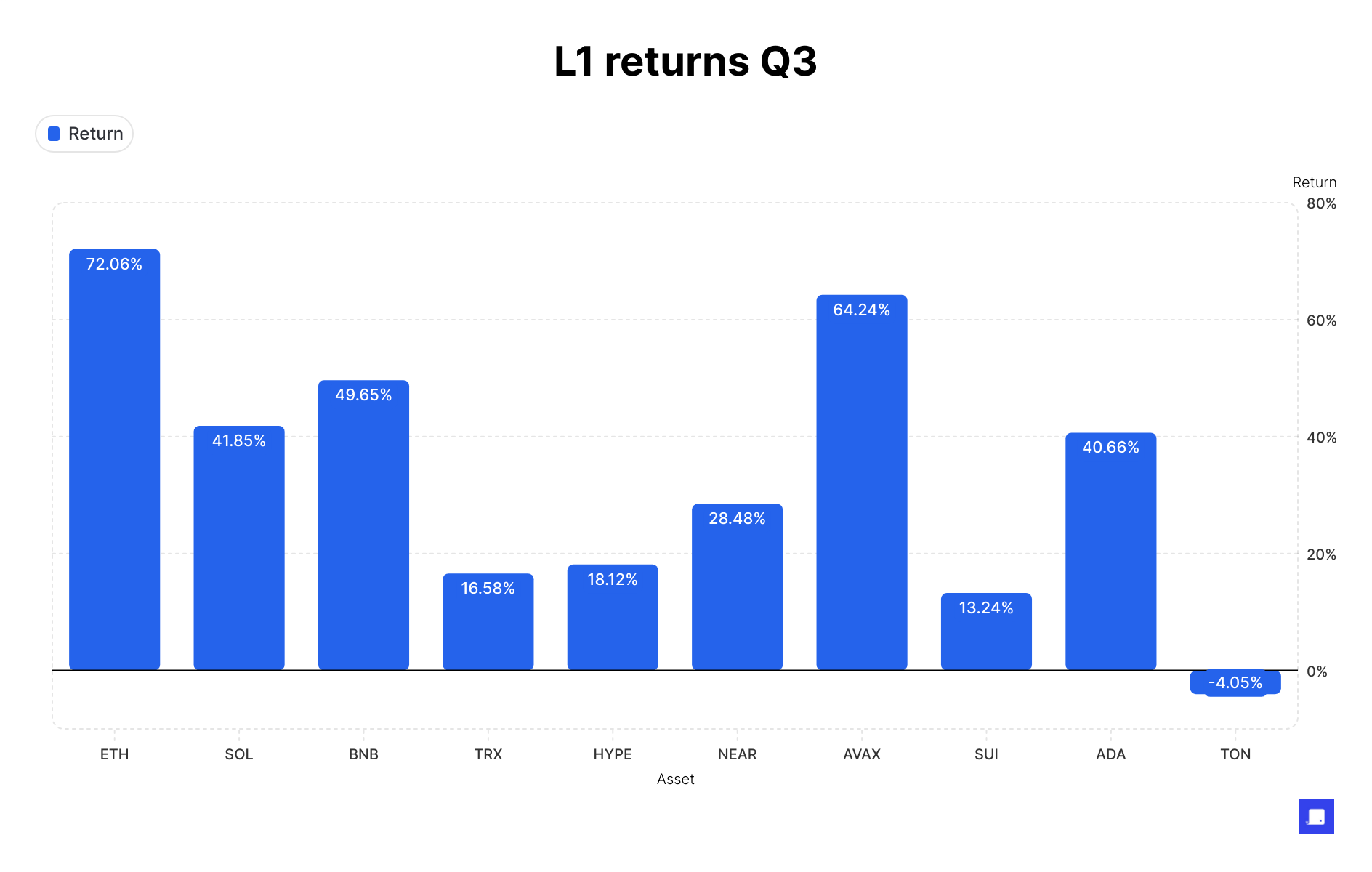 Kuartal ini juga menandai awal altcoin season yang sesungguhnya. Layer-1 seperti Ethereum dan BNB Smart Chain mengalami lonjakan aktivitas ekonomi riil, bukan sekadar rotasi spekulatif. Ethereum mencatat peningkatan nilai ekonomi on-chain hingga +$50 juta, sementara Hyperliquid memecahkan rekor dengan memproses lebih dari 7,3 miliar transaksi per minggu.