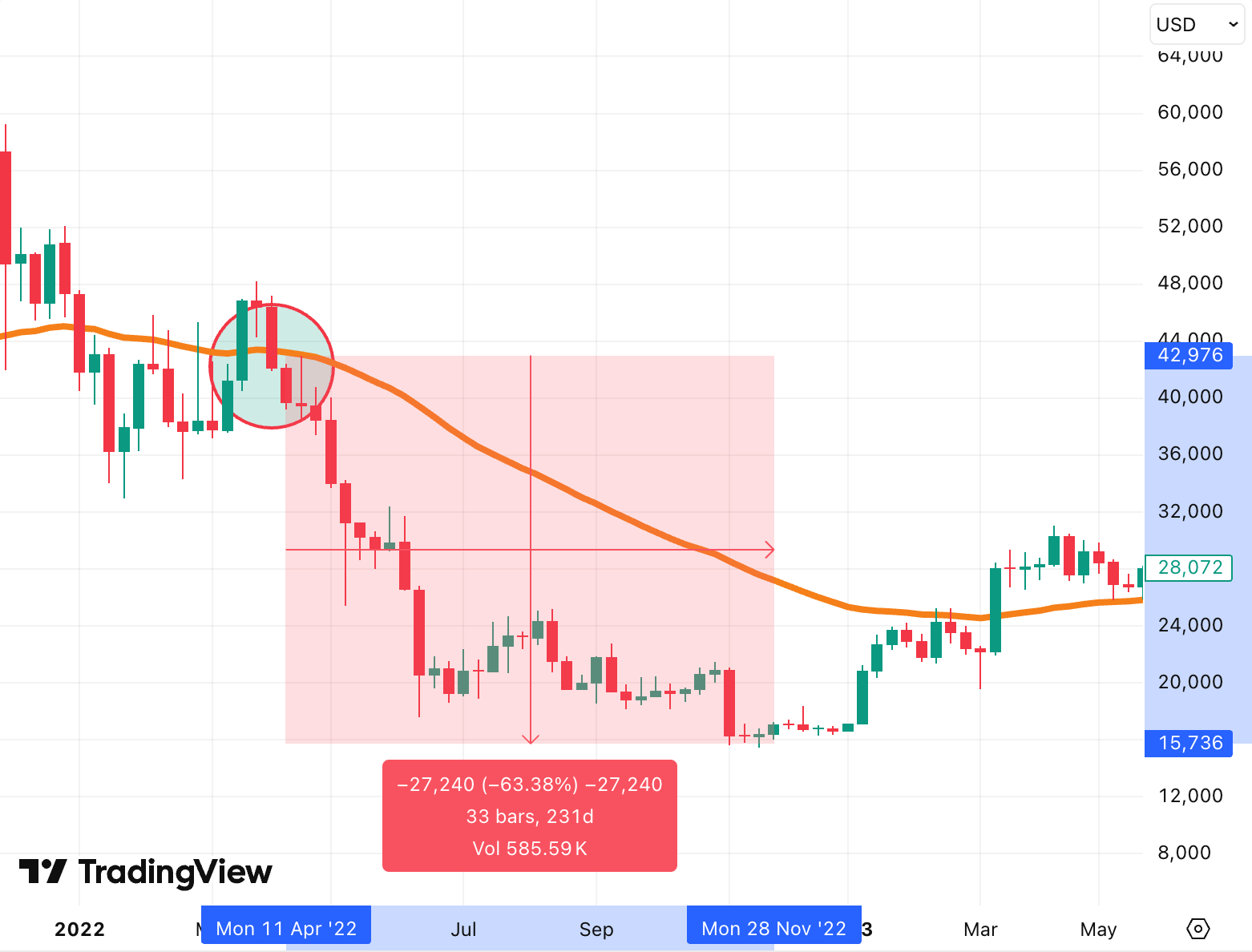 Kamu dapat dengan mudah membaca grafik pergerakan Bitcoin dengan indikator 50-week EMA (Exponential Moving Average) sebagai salah tren jangka menengah hingga panjang.