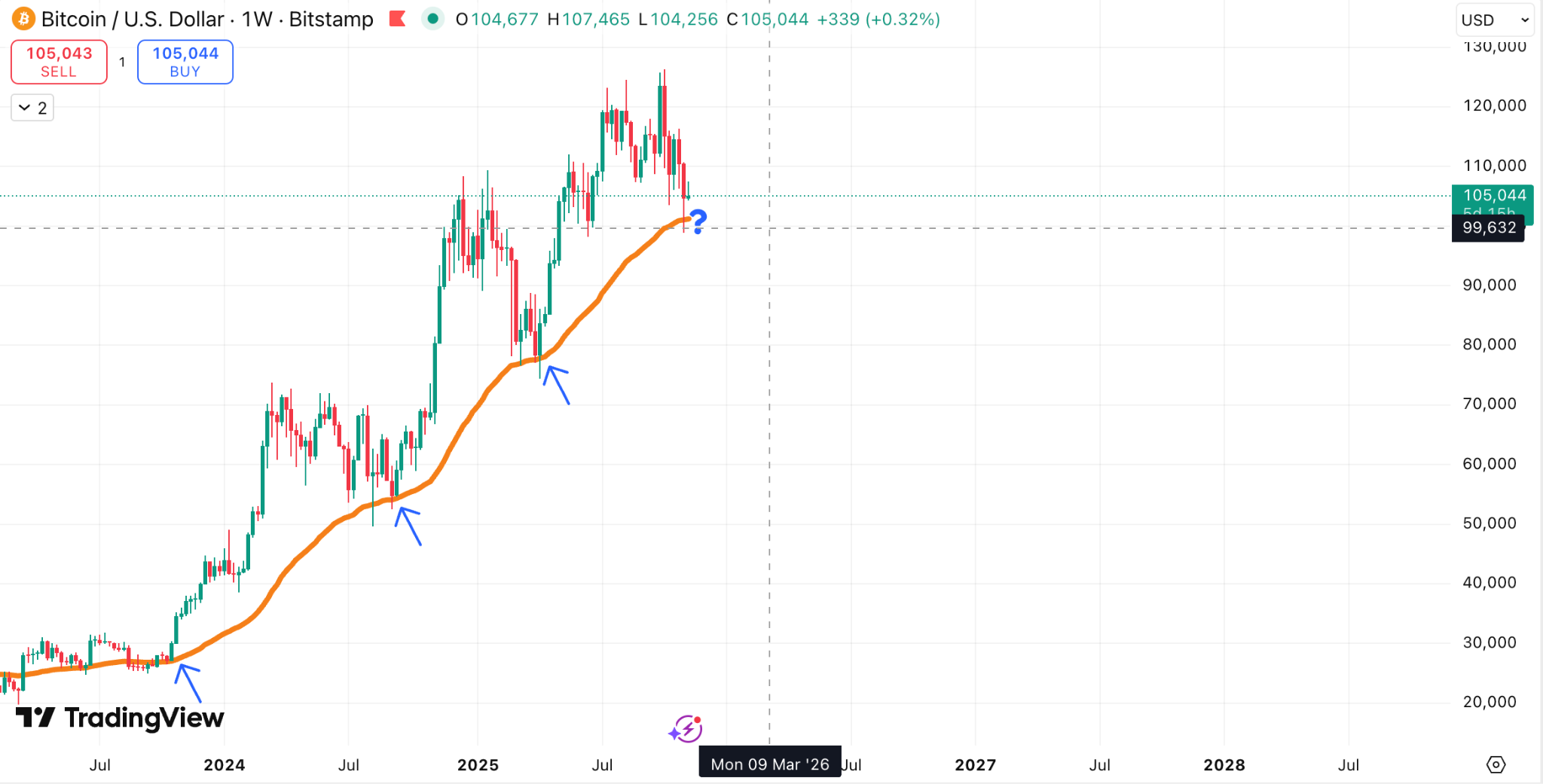 Secara historis, garis 50-week EMA (Exponential Moving Average) sering kali menjadi titik krusial dalam menentukan arah tren jangka panjang Bitcoin. Ketika harga mampu bertahan di atas garis ini, pasar cenderung melanjutkan reli dan memasuki fase bull market yang lebih kuat.