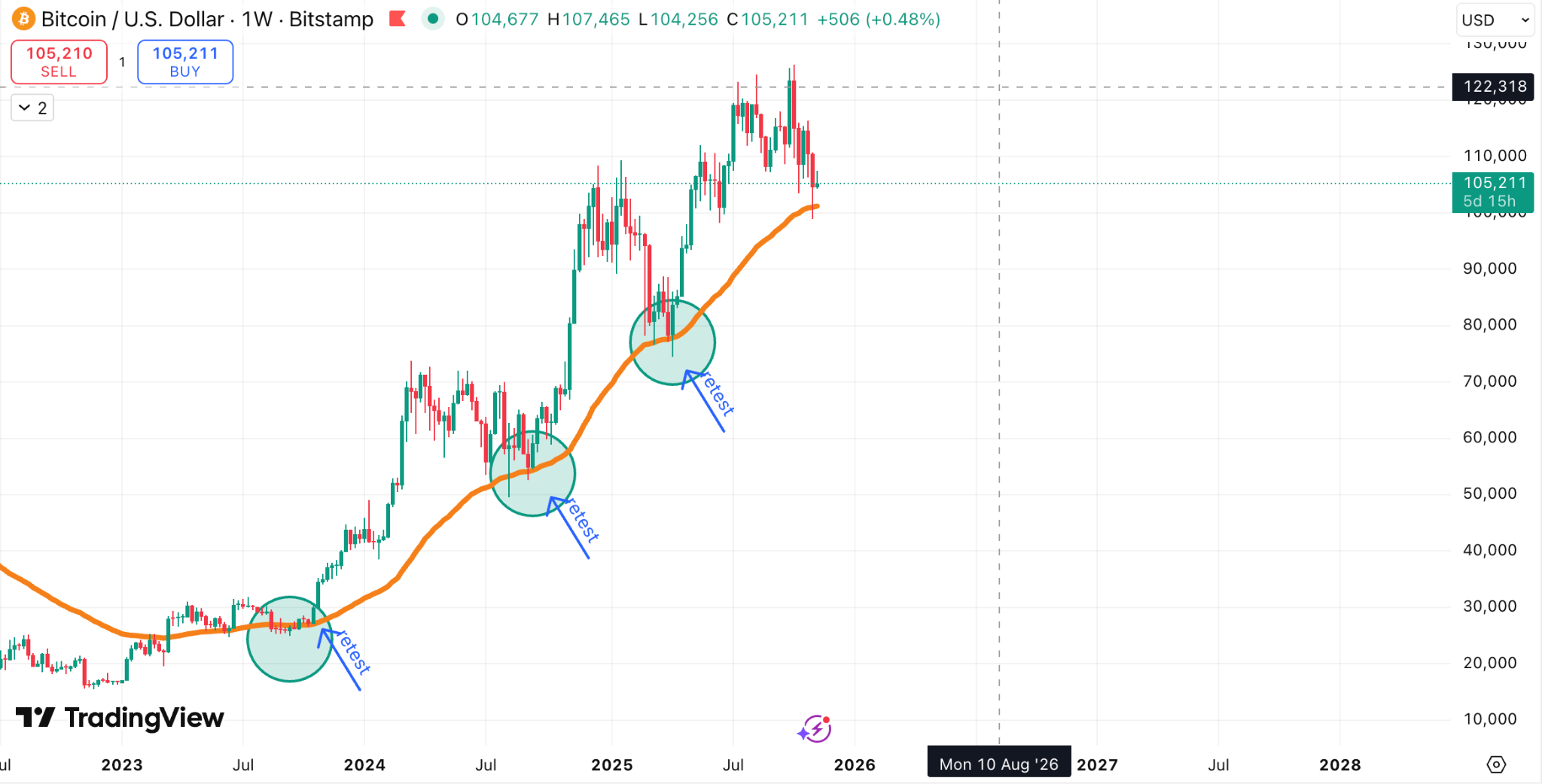 Pola serupa muncul pada bear market tahun 2023–2025, di mana retest yang berhasil menembus garis tersebut setelah harga berada di bawah garis 50-week EMA menyebabkan rally menuju all-time high baru.