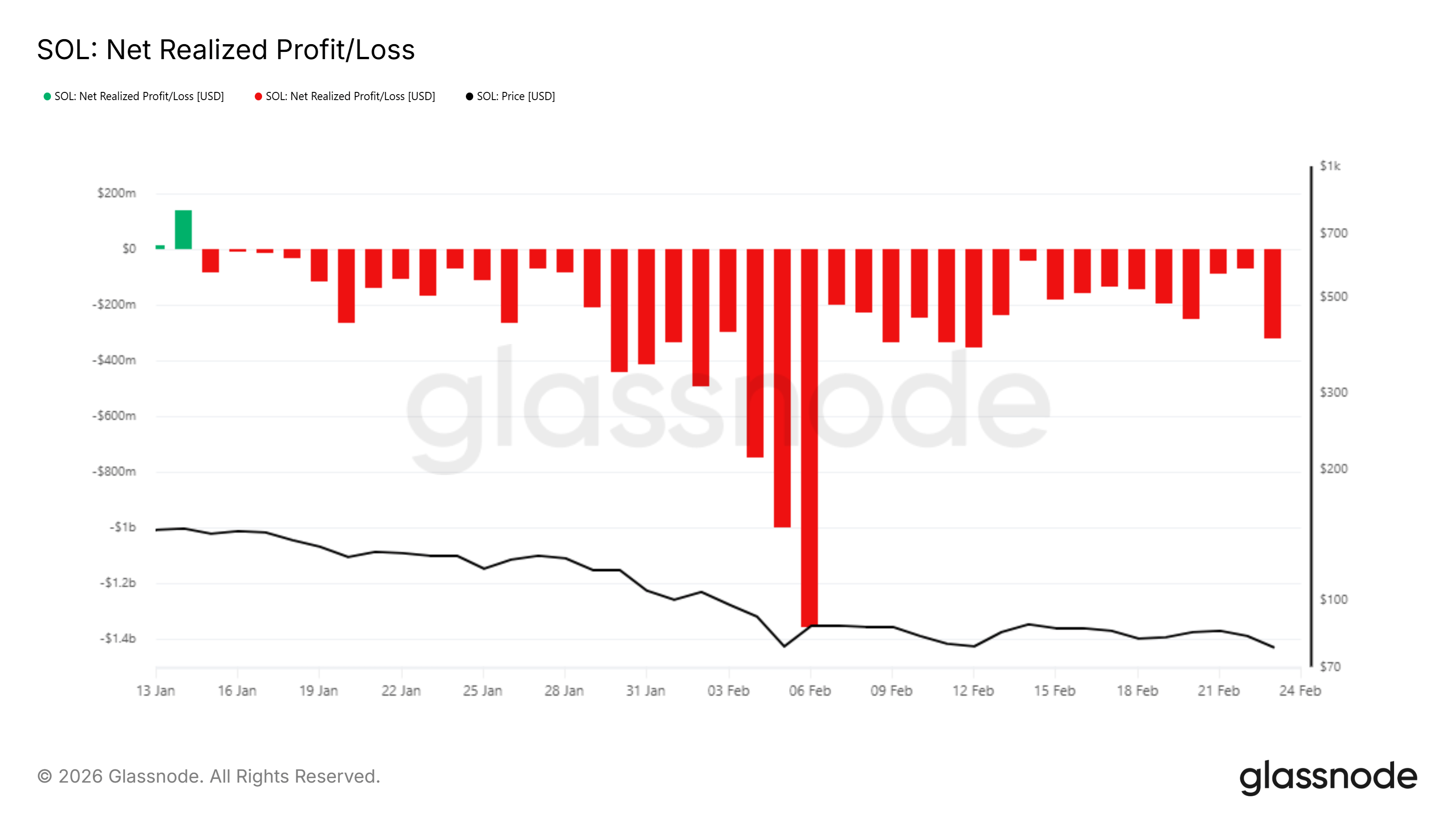 Data on-chain menunjukkan investor SOL masih berhati-hati. Realized Net Profit and Loss mencatat lonjakan kerugian terealisasi sebesar US$68 juta dalam 24 jam terakhir, sehingga total kerugian terealisasi mencapai US$317 juta.