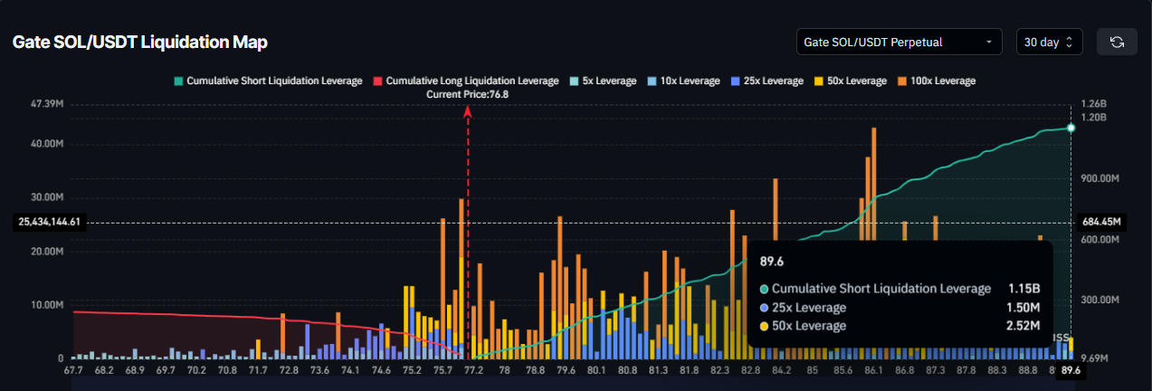 Jika harga SOL naik ke US$89, potensi likuidasi short diperkirakan mencapai US$1,15 miliar. Sebaliknya, jika harga turun ke US$67, potensi likuidasi long hanya sekitar US$242 juta.
