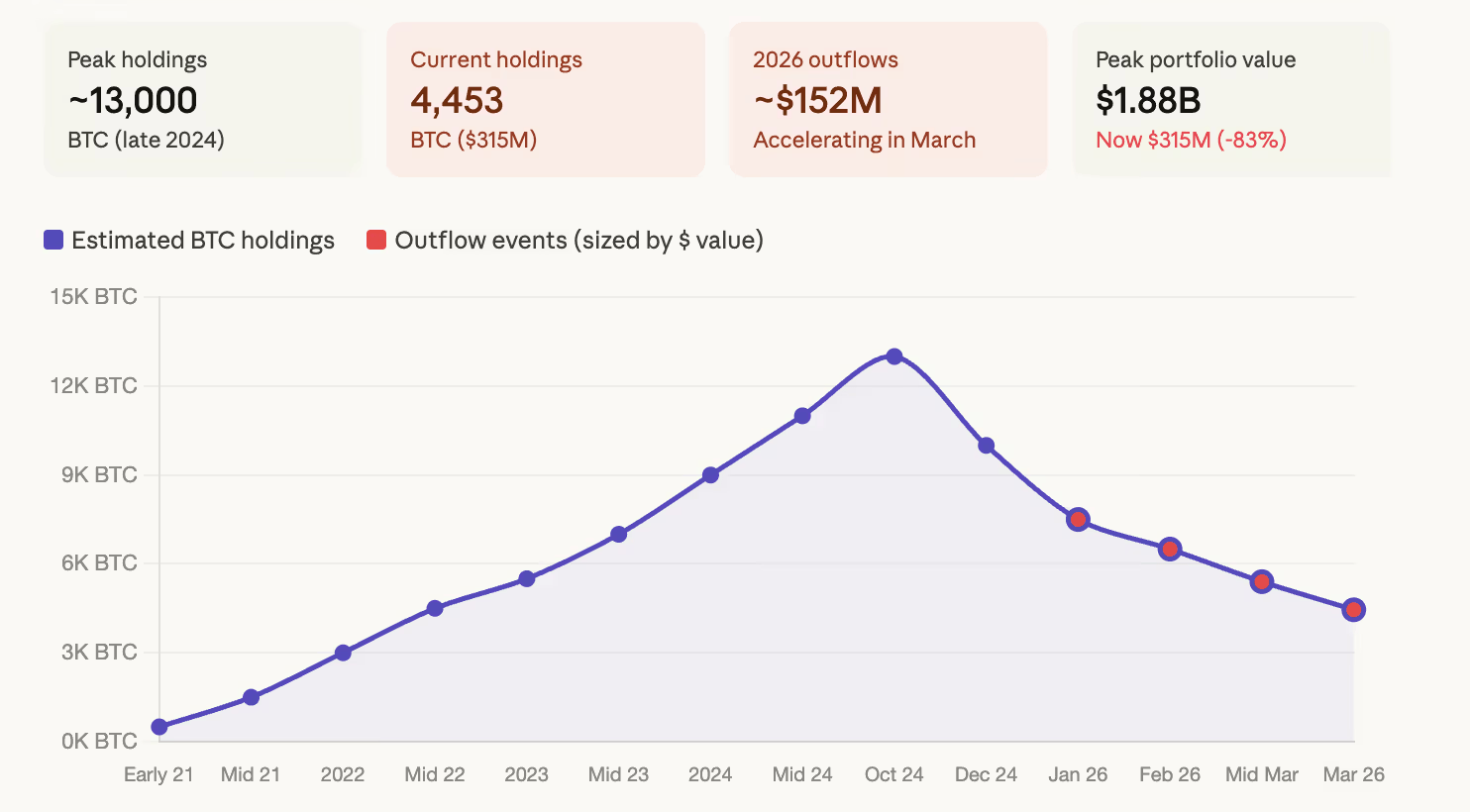 Nilai portofolio juga ikut tertekan, dari sempat mencapai $1,88 miliar kini tersisa sekitar $315 juta, dipengaruhi oleh kombinasi aksi jual dan penurunan harga Bitcoin dari $119.000 ke kisaran $70.000.