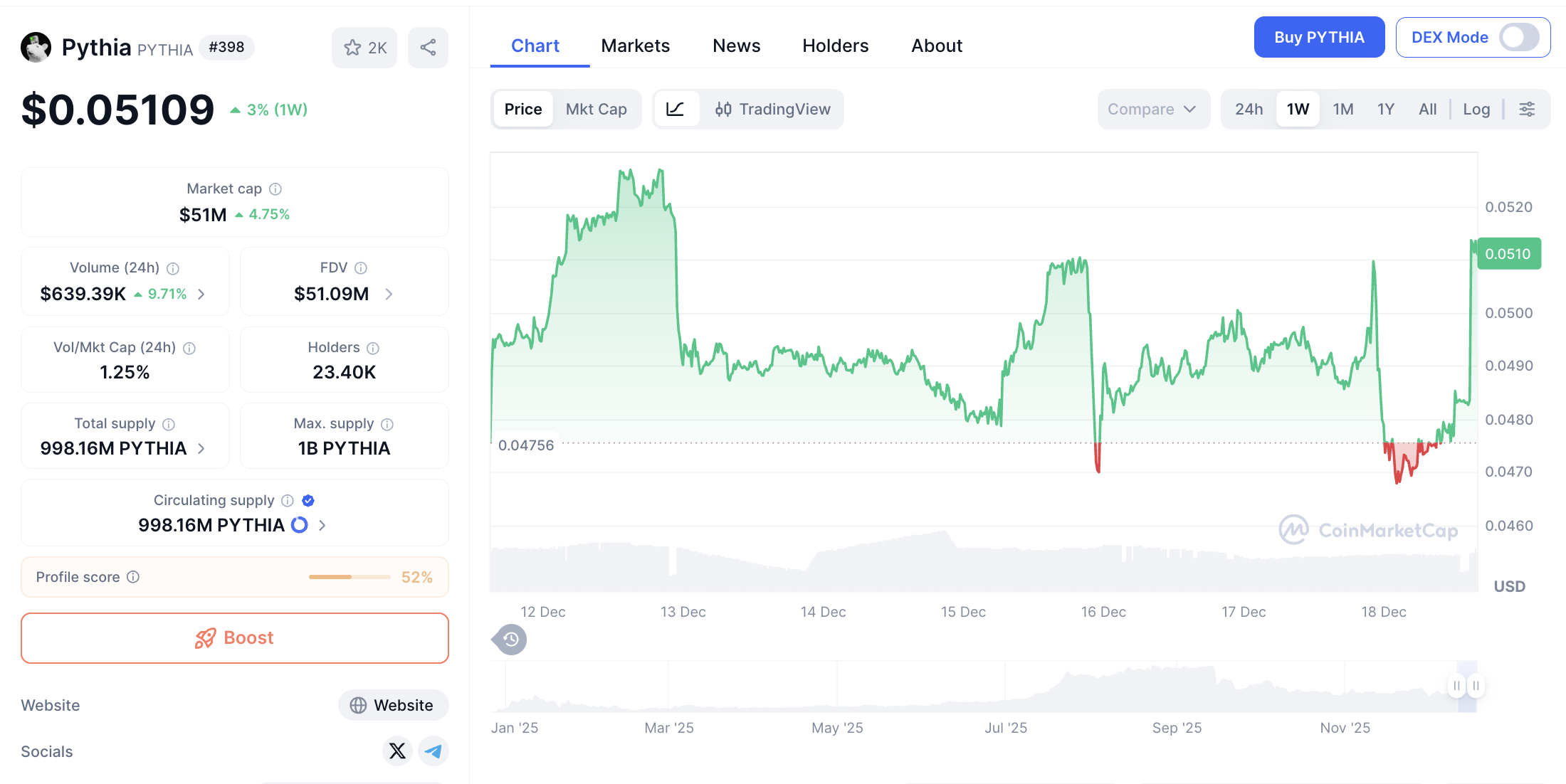 Dalam 24 jam terakhir, PYTHIA mencatat kenaikan 4.73%, sementara dalam 7 hari terakhir naik 3.24%. Volume transaksi harian tercatat sebesar $708,034, dengan jumlah suplai beredar 13.85M PYTHIA dari total hampir 1 miliar token.